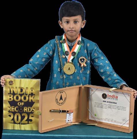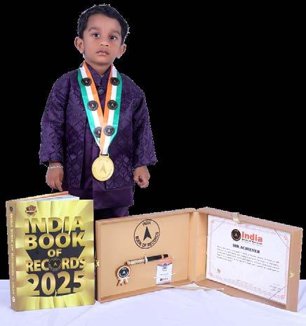 Thejas Ajith (born on November 7, 2023) of Thiruvananthapuram, Kerala, is titled as ‘IBR Achiever’ for identifying 22 animals, 25 birds, 22 vegetables, 22 fruits, 11 colours, 23 vehicles, 22 professionals, 12 shapes, 22 flowers, 12 water animals, 12 insects and 20 parts of the body; counting from 1 to 10; reciting letters of the English alphabet and days of the week; performing 15 actions and Surya Namaskar, at the age of 1 year and 10 months, as confirmed on September 16, 2025.