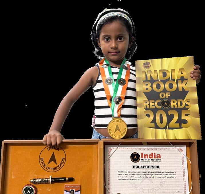 Aditi Reddy Guldas (born on February 25, 2021) of Raichur, Karnataka, is titled as ‘IBR Achiever’ for recalling the capitals of one hundred countries in 1 minute and 53 seconds, at the age of 4 years and 7 months, as confirmed on October 6, 2025.