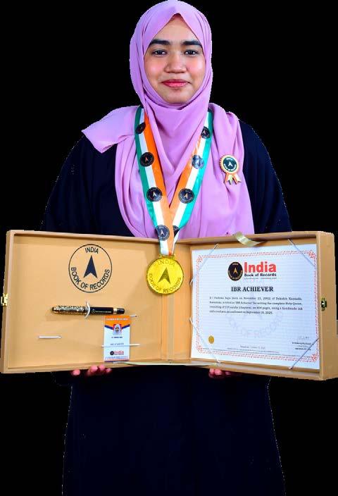 B I Fathima Sajla (born on November 23, 2002) of Dakshin Kannada, Karnataka, is titled as ‘IBR Achiever’ for writing the complete Holy Quran, consisting of 114 surahs (chapters), on 604 pages, using a handmade ink and a reed pen, as confirmed on September 18, 2025.