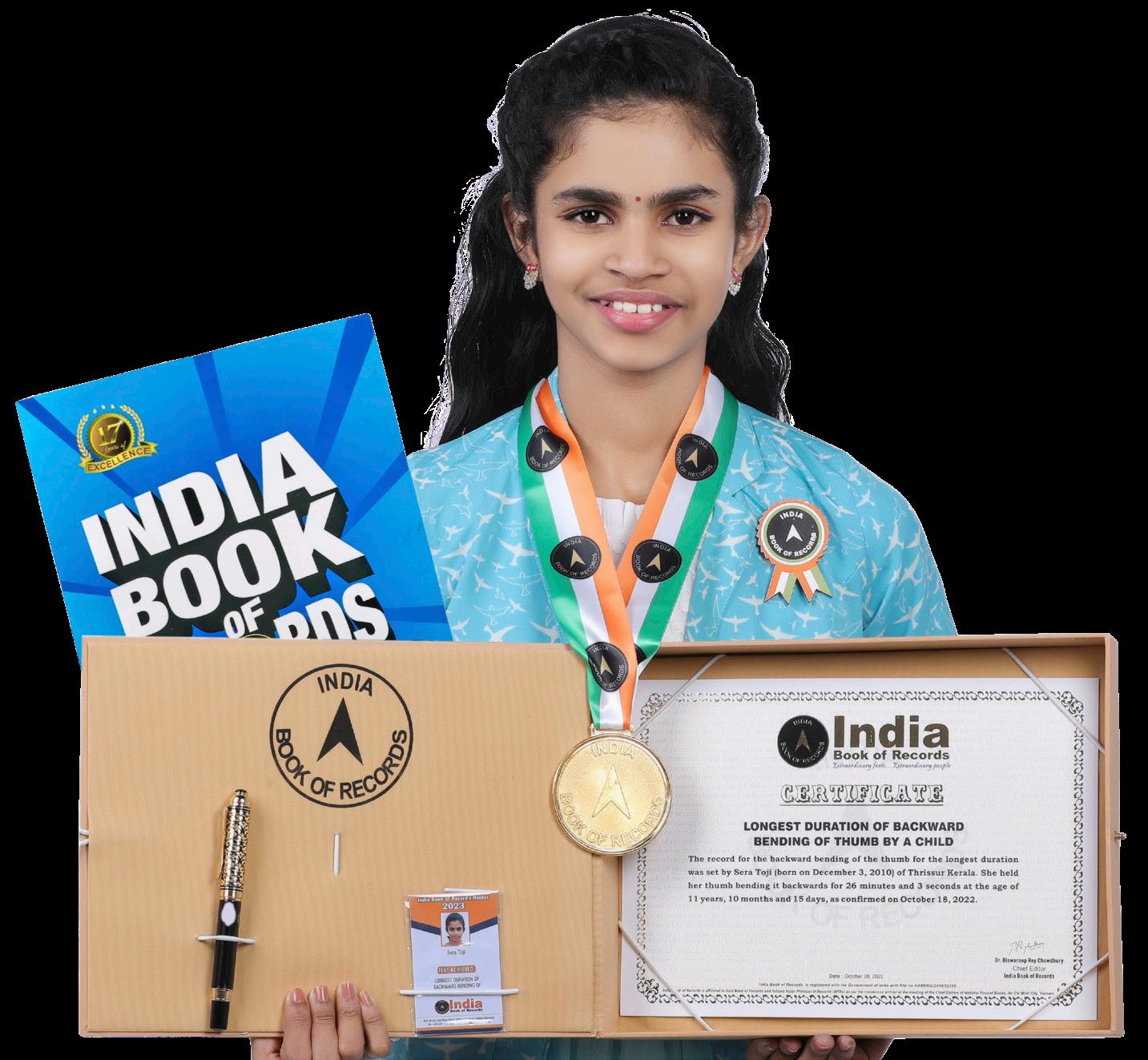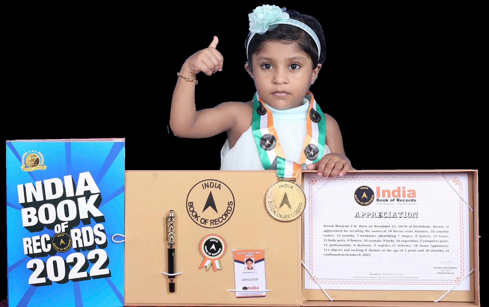 (born on November 23, 2019) of Kozhikode, Kerala, is appreciated for recalling the names of 14 Kerala state districts, 10 country names, 12 months, 7-weekdays, identifying 7 shapes, 8 insects, 13 fruits, 21 body parts, 9 flowers, 30 animals, 9 birds, 16 vegetables, 5 computer parts, 12 professionals, 6 festivals, 5 reptiles,12 vehicles, 10 home appliances, 111 objects and reciting 8 rhymes at the age of 2 years and 10 months, as