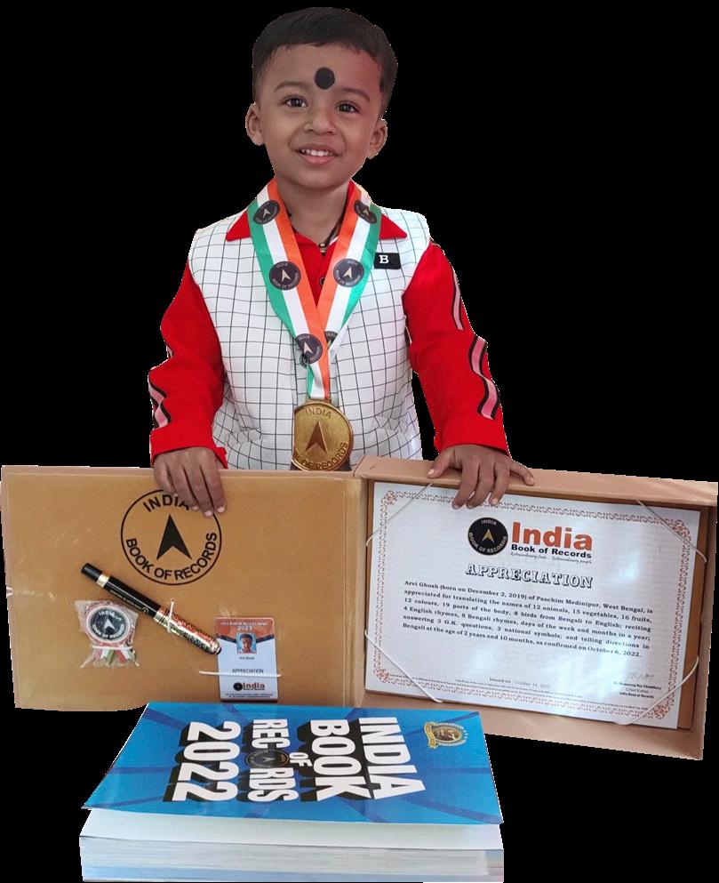 Darshan Chakraborty (born on September 13, 2020) of Paschim Medinipur, West Bengal, is appreciated for recalling 19 words in English, 10 other words; identifying corresponding pictures of the English alphabet, 18 fruits, 12