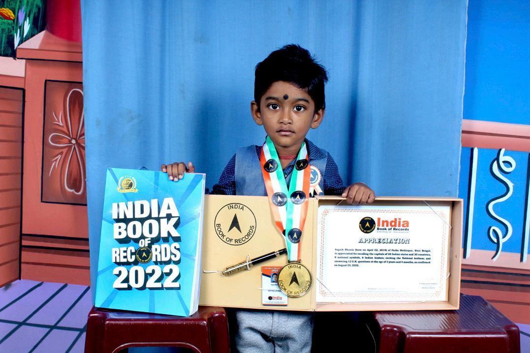 Sagnik Bhunia (born on April 02, 2019) of Purba Medinipur, West Bengal, is appreciated for recalling the capitals of 28 Indian states and 30 countries, 9 national symbols, 6 Indian leaders; reciting the National Anthem; and answering 12 G.K. questions at the age of 3 years and 4 months, as confirmed on August 25, 2022.