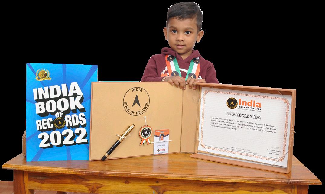 Aayansh Veeramally (born on October 1, 2019) of Hyderabad, Telangana, is appreciated for solving the Indian geographical map puzzle of 24 pieces in 2 minutes and 54 seconds at the age of 2 years and 10 months, as confirmed on August 25, 2022.