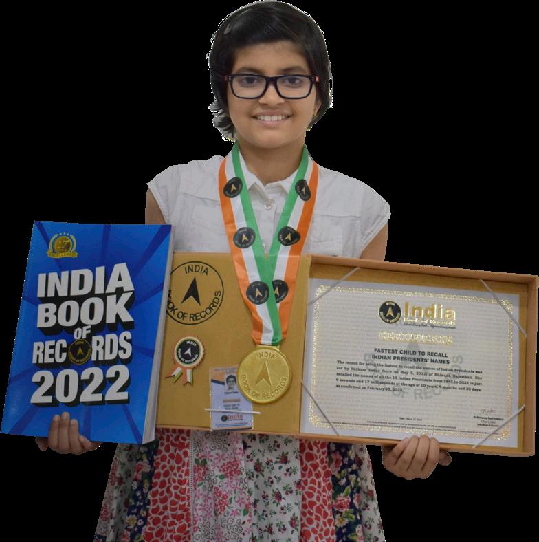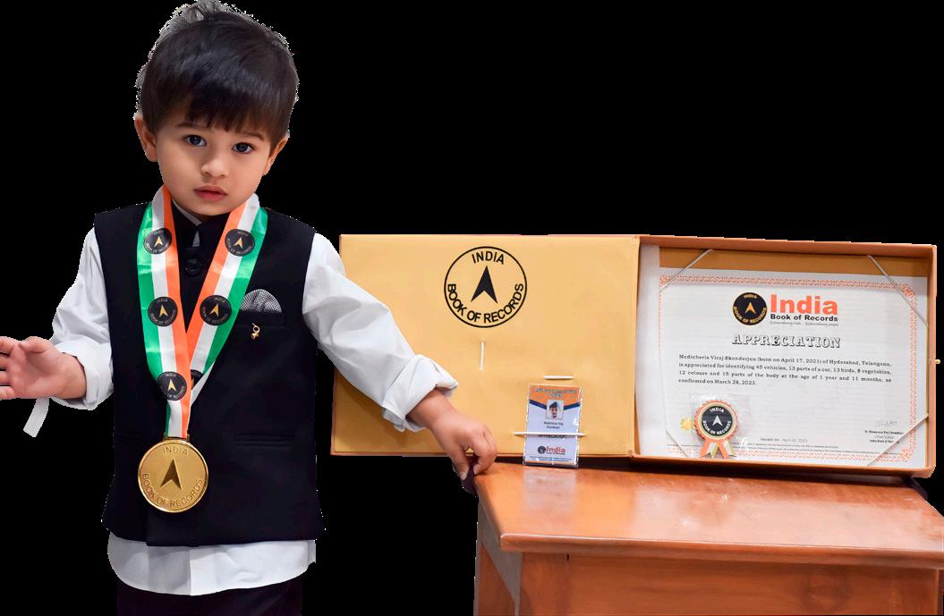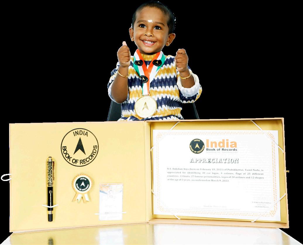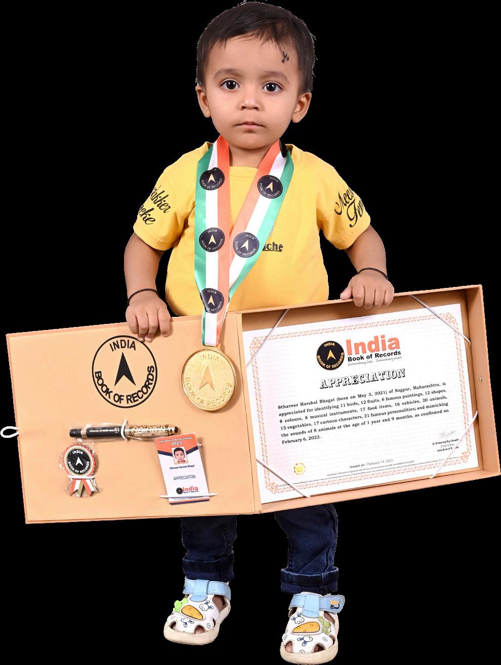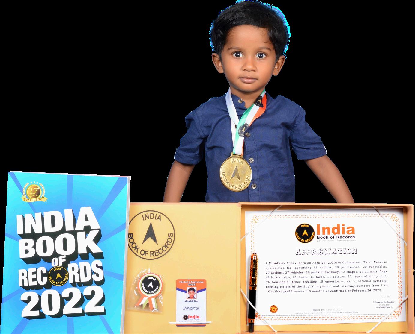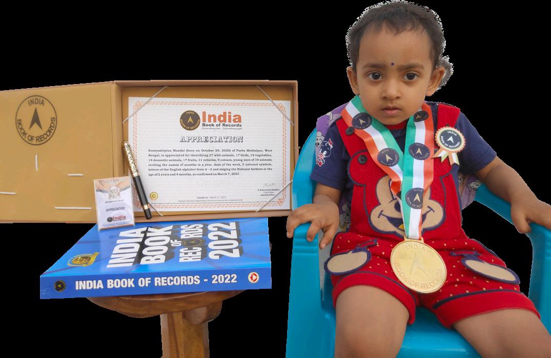 (born on August 8, 2018) of Bengaluru, Karnataka, is appreciated for identifying 4 famous personalities, 60 animals, 26 fruits, 10 shapes, 28 vegetables, 14 vehicles, 16 parts of the body, 7 flowers, 32 actions, 15 colours, 5 sense organs; reciting letters from A to Z, days of the week, months in a year, 5 national symbols, 9 rhymes, 1 mantra; mimicking the sounds of 10 animals; and counting numbers from 1 to 100 at the age of 4 years and 7 months, as confirmed on March 20, 2023.