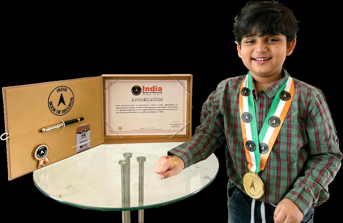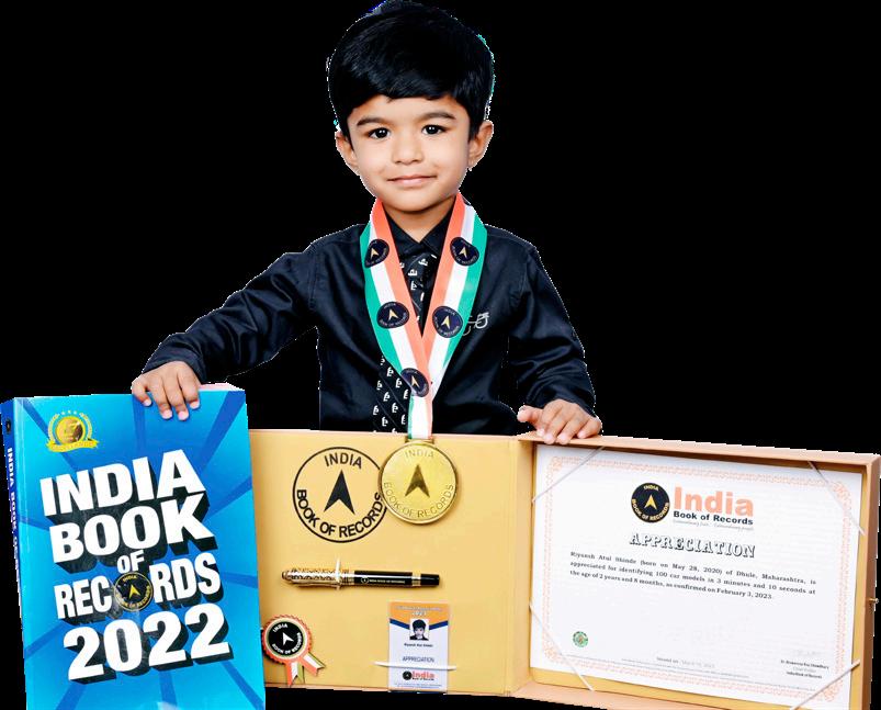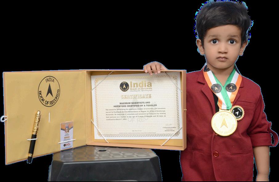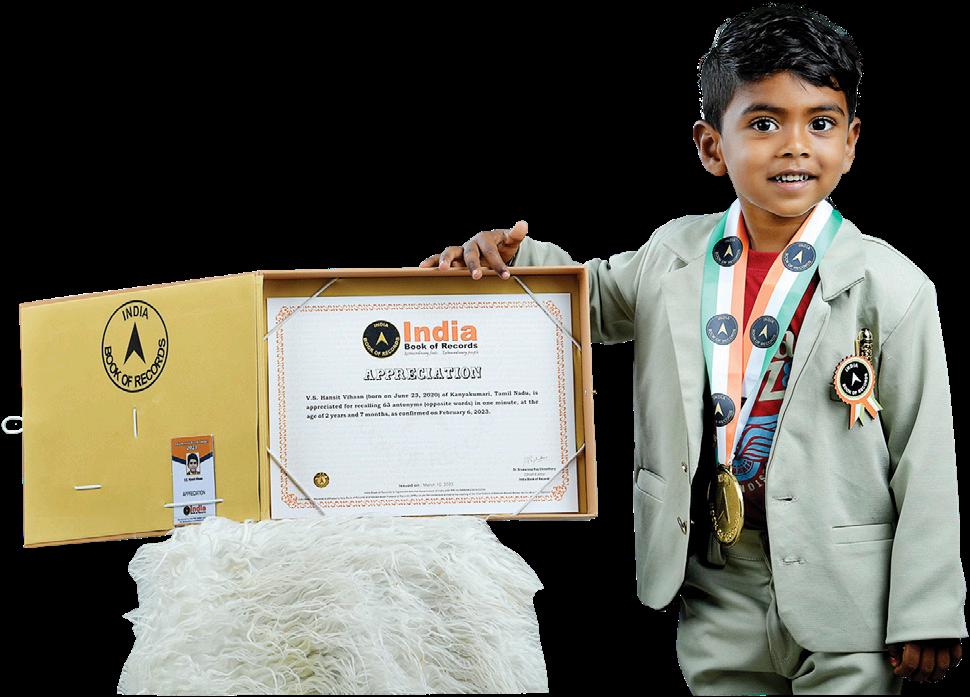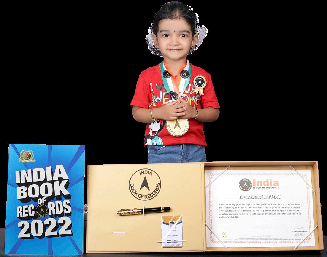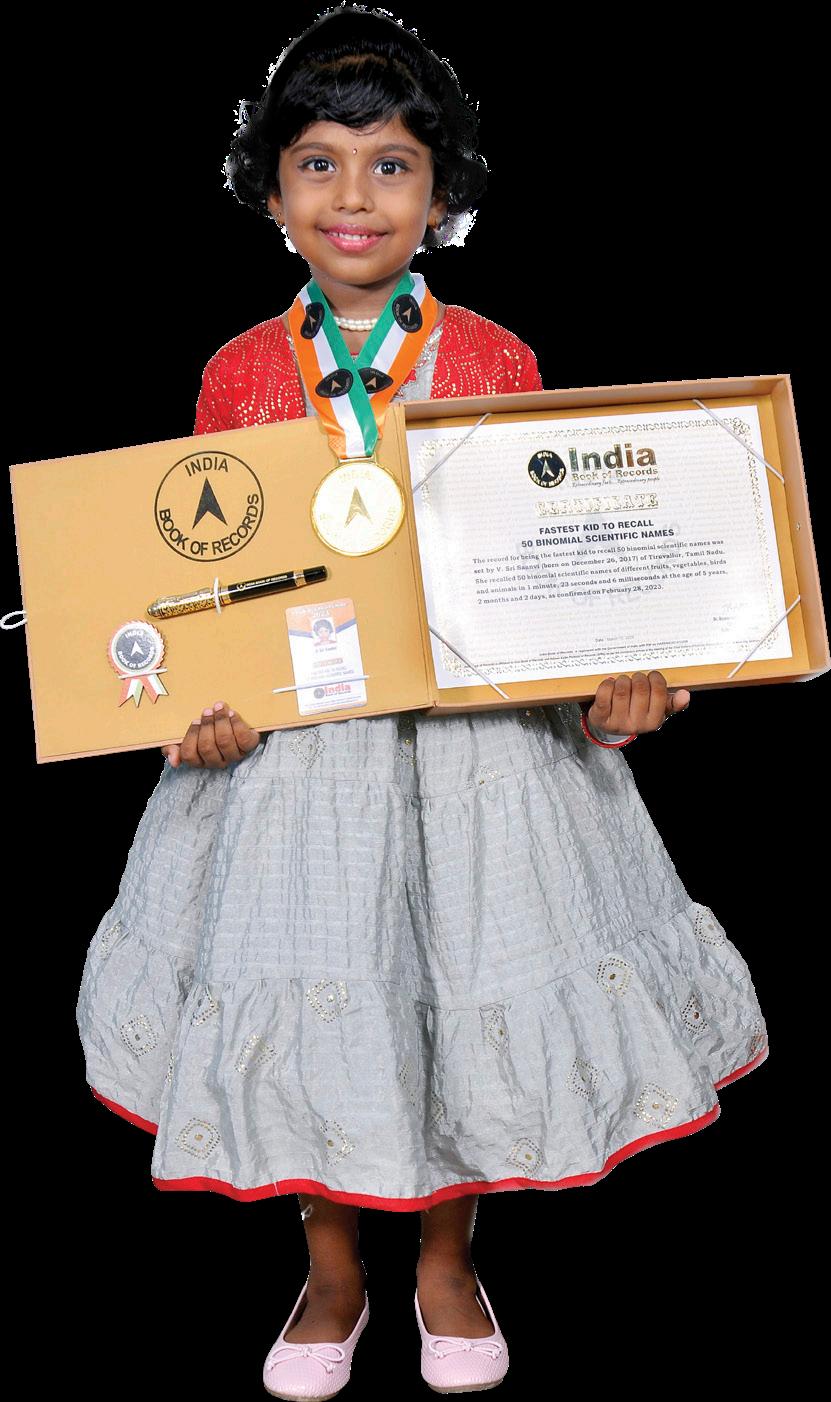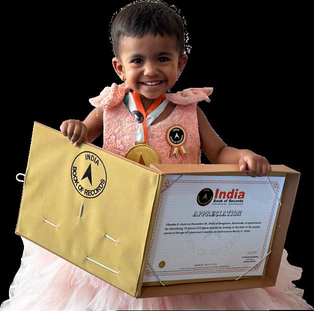 (born on August 8, 2018) of Bengaluru, Karnataka, is appreciated for identifying 4 famous personalities, 60 animals, 26 fruits, 10 shapes, 28 vegetables, 14 vehicles, 16 parts of the body, 7 flowers, 32 actions, 15 colours, 5 sense organs; reciting letters from A to Z, days of the week, months in a year, 5 national symbols, 9 rhymes, 1 mantra; mimicking the sounds of 10 animals; and counting numbers from 1 to 100 at the age of 4 years and 7 months, as confirmed on March 20, 2023.