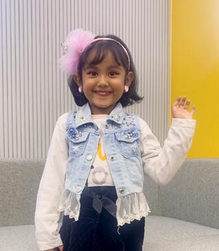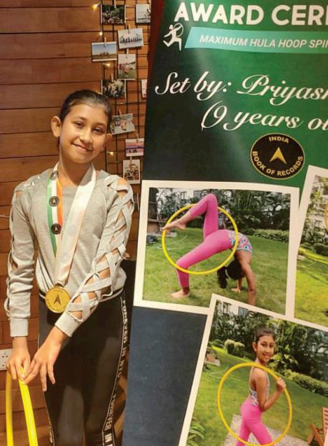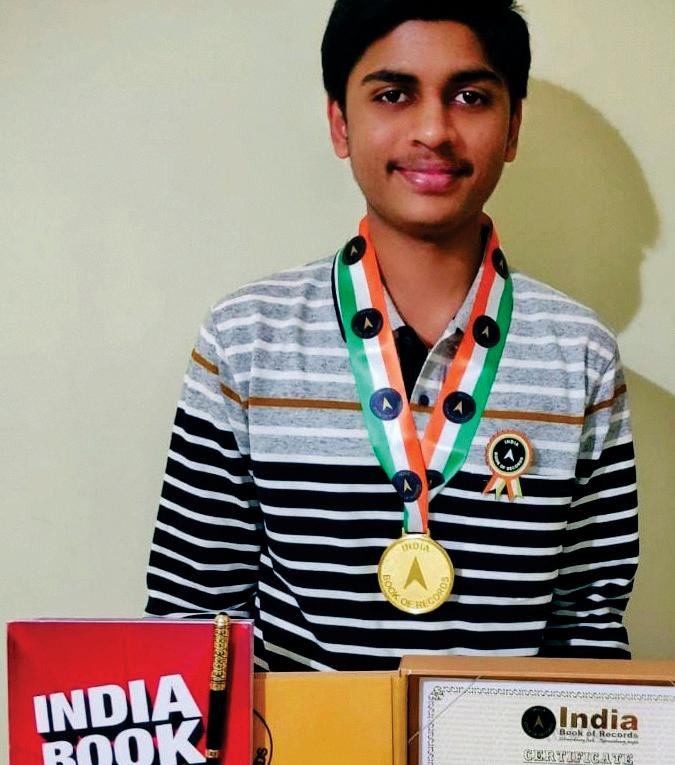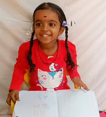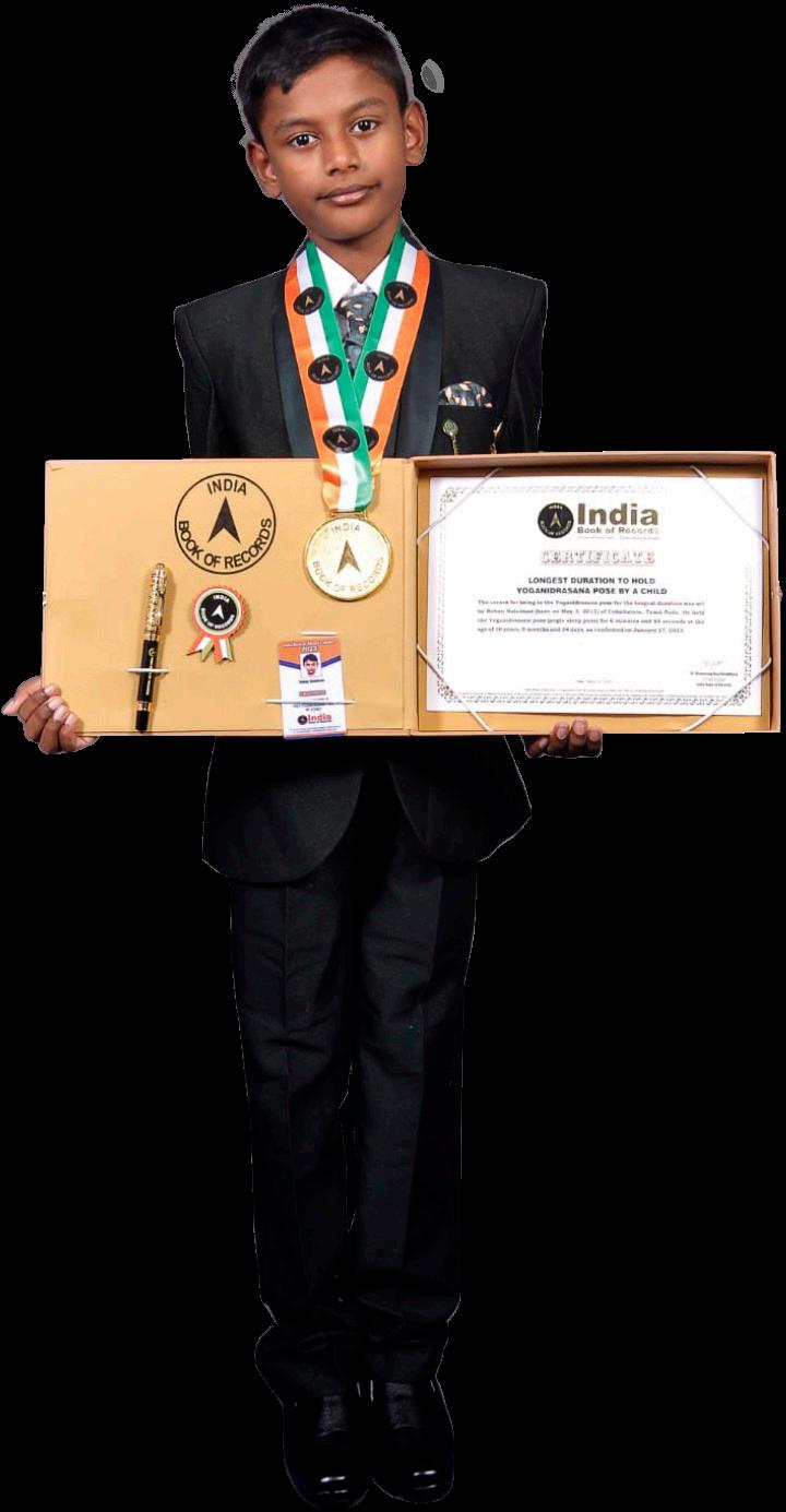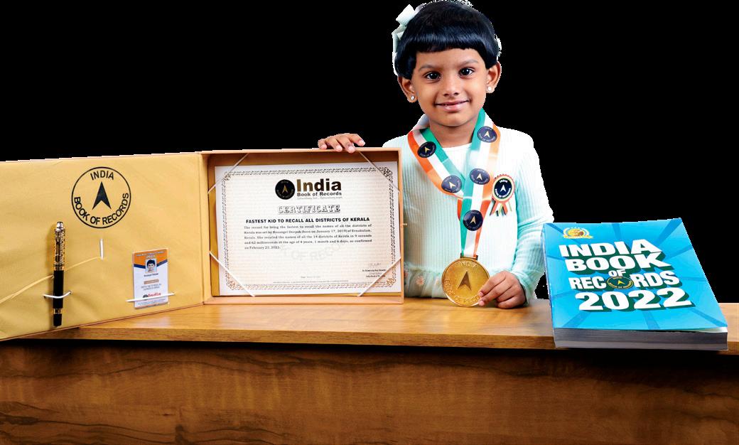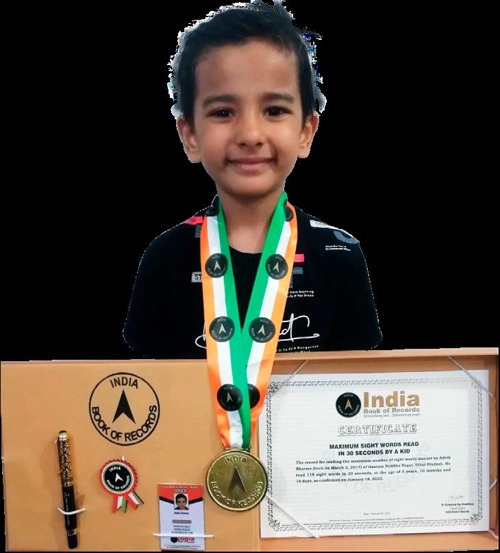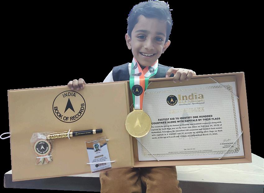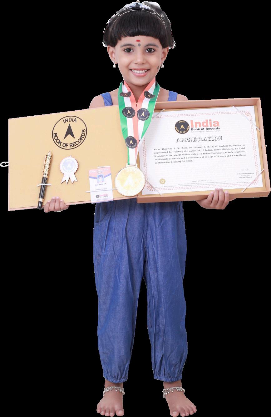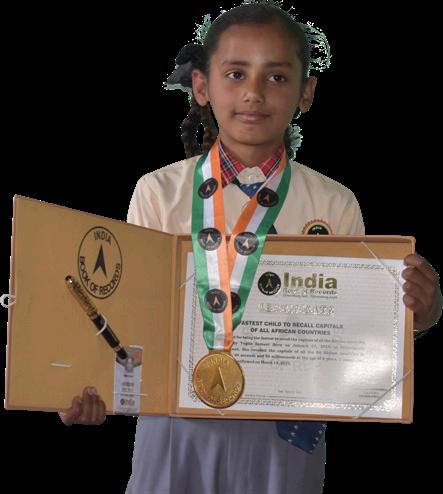 (born on August 8, 2018) of Bengaluru, Karnataka, is appreciated for identifying 4 famous personalities, 60 animals, 26 fruits, 10 shapes, 28 vegetables, 14 vehicles, 16 parts of the body, 7 flowers, 32 actions, 15 colours, 5 sense organs; reciting letters from A to Z, days of the week, months in a year, 5 national symbols, 9 rhymes, 1 mantra; mimicking the sounds of 10 animals; and counting numbers from 1 to 100 at the age of 4 years and 7 months, as confirmed on March 20, 2023.