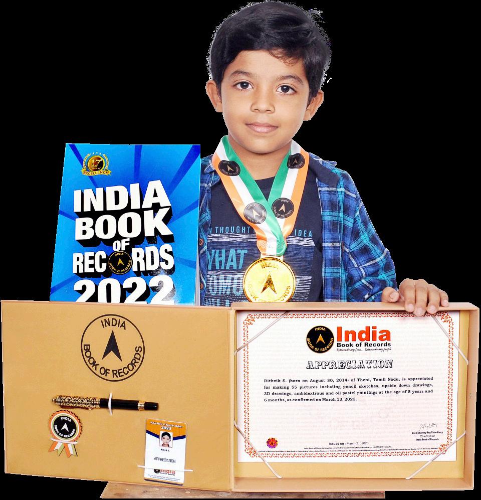 Rithvik S. (born on August 30, 2014) of Theni, Tamil Nadu, is appreciated for making 55 pictures including pencil sketches, upside down drawings, 3D drawings, ambidextrous and oil pastel paintings at the age of 8 years and 6 months, as confirmed on March 13, 2023.