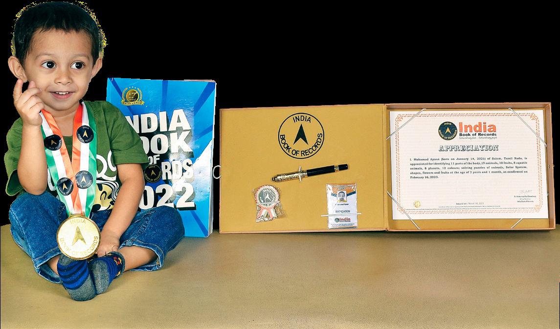 I. Mohamad Ayaan (born on January 14, 2021) of Salem, Tamil Nadu, is appreciated for identifying 11 parts of the body,19 animals, 10 fruits, 8 aquatic animals, 8 planets, 12 colours; solving puzzles of animals, Solar System, shapes, flowers and fruits at the age of 2 years and 1 month, as confirmed on February 16, 2023.