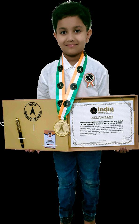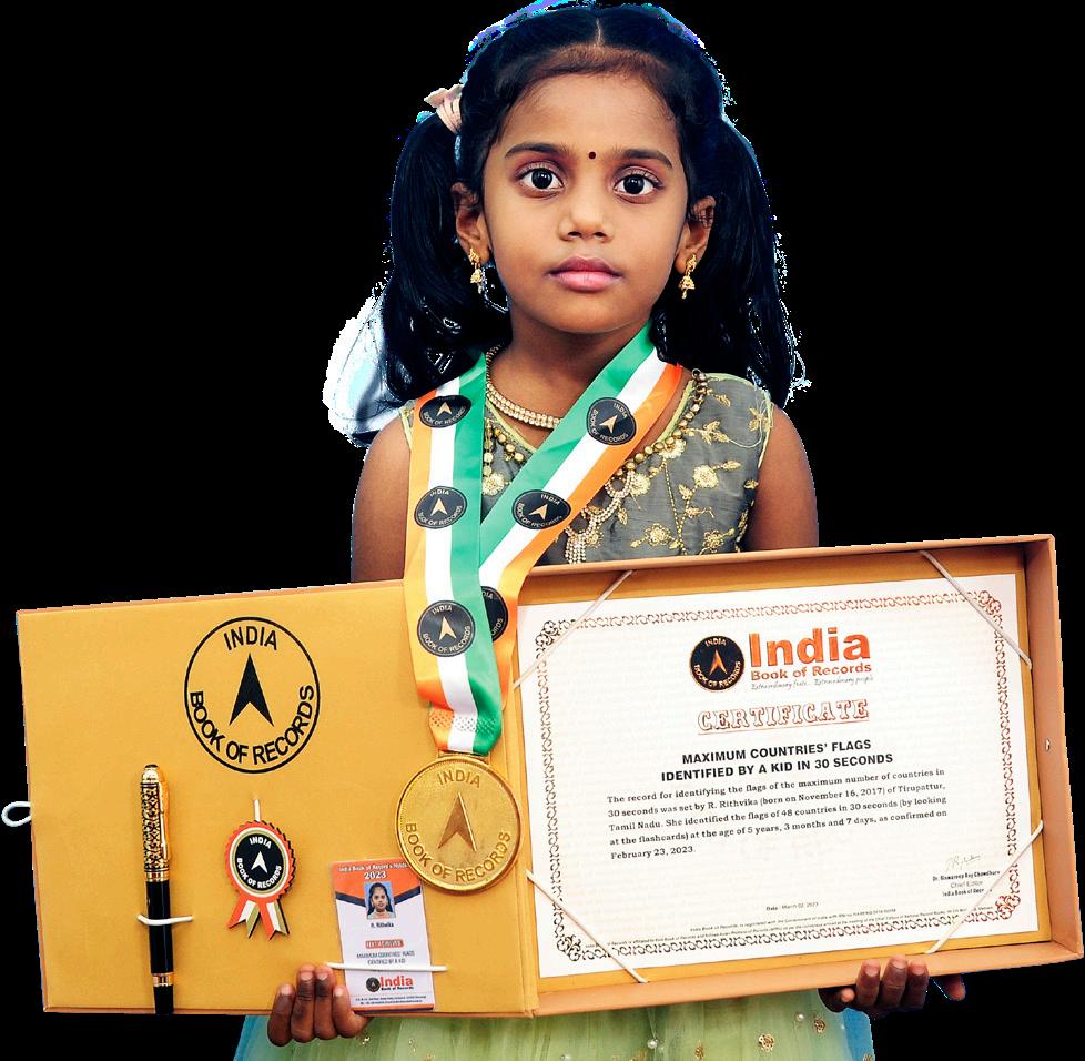 for identifying the flags of 133 countries, 19 shapes, 18 colours, 45 aquatic animals, 21 monuments, 43 fruits, 30 insects, 30 flowers, 30 food items; naming 13 national symbols, shelters of 14 animals, young ones of 20 animals, 8 planets, 66 animals, 45 birds, 20 shapes, numbers from 1 to 20; and answering 3 G.K. questions at the age of 2 years and 5 months, as confirmed on February 23, 2023.