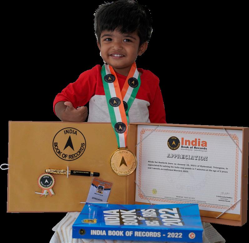 Allada Sai Saathvik (born on January 16, 2021) of Hyderabad, Telangana, is appreciated for solving the India map puzzle in 7 minutes at the age of 2 years and 1 month, as confirmed March 6, 2023.