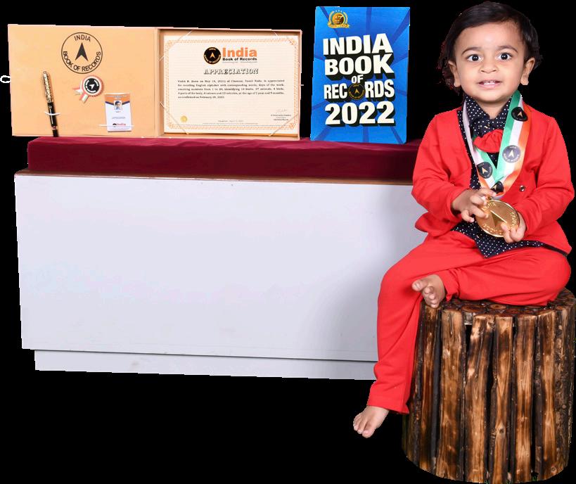 Vedik R. (born on May 14, 2021) of Chennai, Tamil Nadu, is appreciated for recalling English alphabet with corresponding words, days of the week; counting numbers from 1 to 20; identifying 10 fruits, 27 animals, 4 birds, 4 parts of the body, 4 colours and 12 vehicles, at the age of 1 year and 9 months, as confirmed on February 28, 2023.