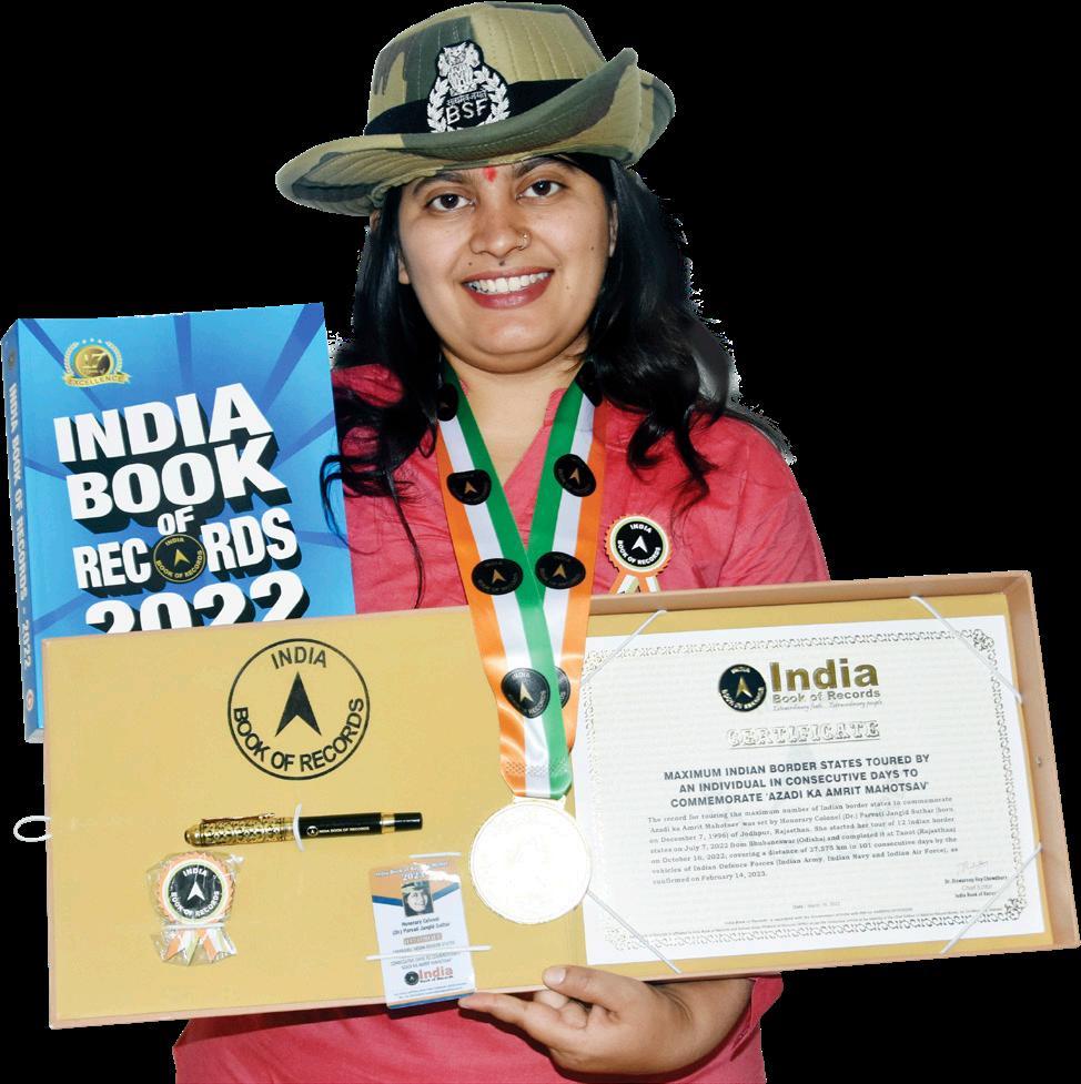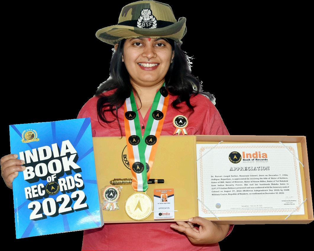 Dr. Parvati Jangid Suthar, Honorary Colonel (born on December 7, 1996) Jodhpur, Rajasthan, is appreciated for receiving the title of ‘Sister of Soldiers, Sister of BSF, Sister of Himveer, Sister of Assam Rifles, Sister of Tat Rakshak’ from Indian Security Forces. She tied her handmade Raksha Sutra to 2,07,575 Indian Defence personnel and was conferred with the honorary rank of Colonel on August 27, 2022 (Moldovan Independence Day 2022) by CGIM Military Centre, Republic of Moldova, as confirmed on December 30, 2022.