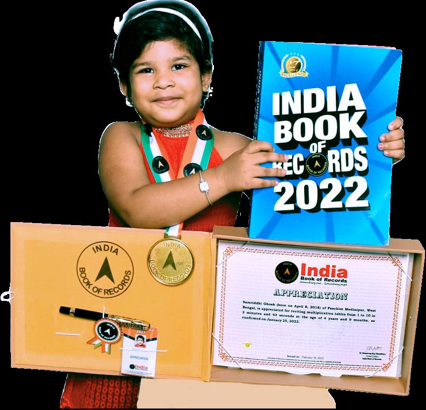Samriddhi Ghosh (born on April 8, 2018) of Paschim Medinipur, West Bengal, is appreciated for reciting multiplication tables from 1 to 10 in 2 minutes and 43 seconds at the age of 4 years and 9 months, as confirmed on January 25, 2023.