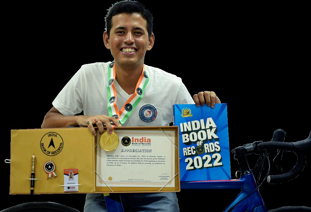 Ripunjay Gogoi (born on December 19, 1993) of Kamrup, Assam, is appreciated for everesting by bicycle. He rode his bicycle up the Pilinkata Climb (Assam), made 78 loops for covering 141.53 km (gaining an