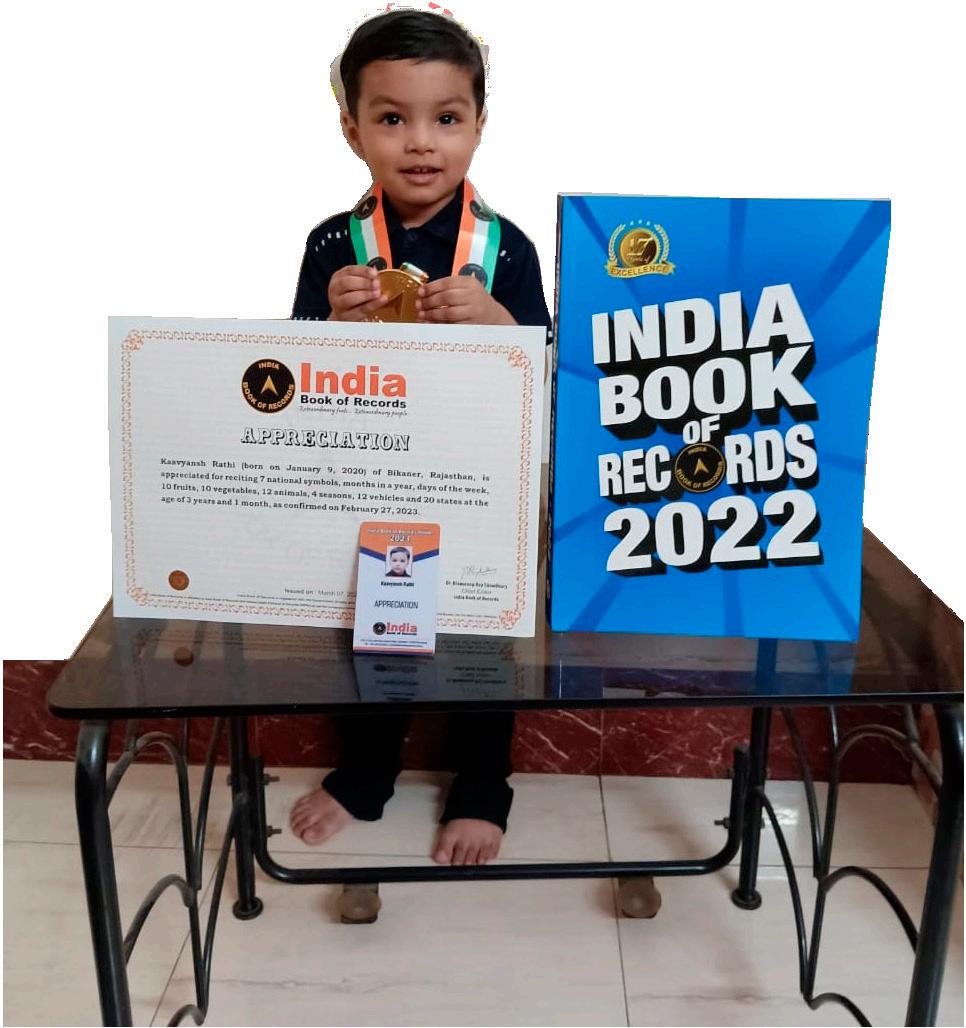 Kaavyansh Rathi (born on January 9, 2020) of Bikaner, Rajasthan, is appreciated for reciting 7 national symbols, months in a year, days of the week, 10 fruits, 10 vegetables, 12 animals, 4 seasons, 12 vehicles and 20 states at the age of 3 years and 1 month, as confirmed on February 27, 2023.