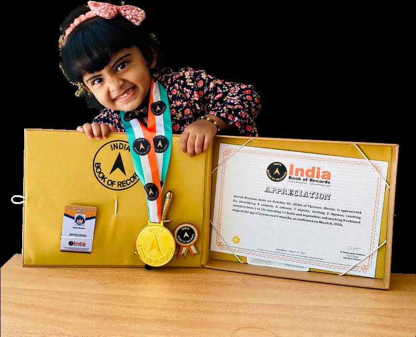 Aairah Maryam (born on October 20, 2020) of Thrissur, Kerala, is appreciated for identifying 4 animals, 6 colours, 7 objects; reciting 2 rhymes; counting numbers from 1 to 10; matching 11 fruits and vegetables; and stacking 5 coloured rings at the age of 2 years and 4 months, as confirmed on