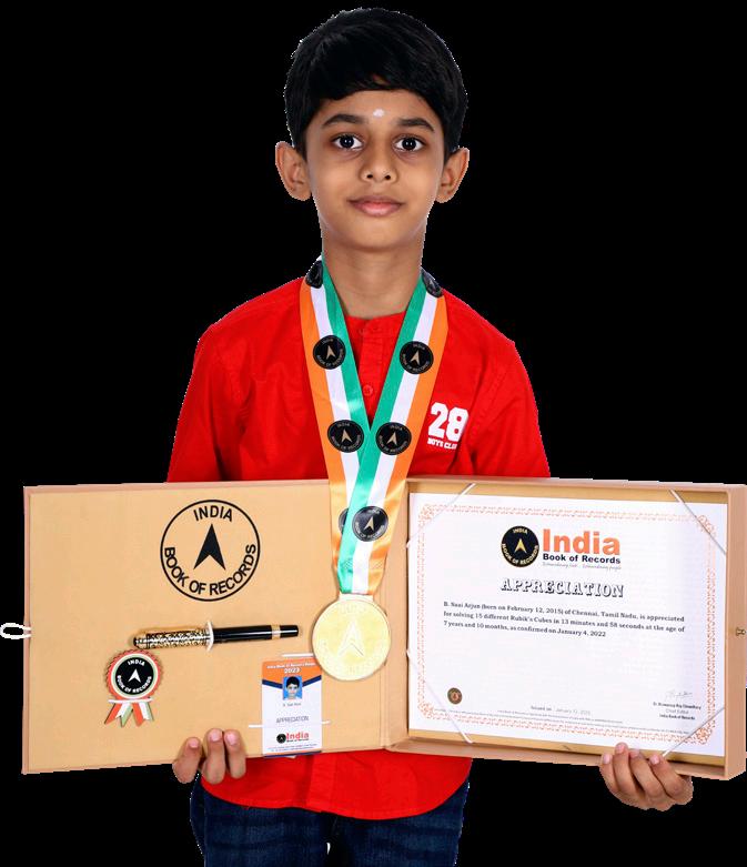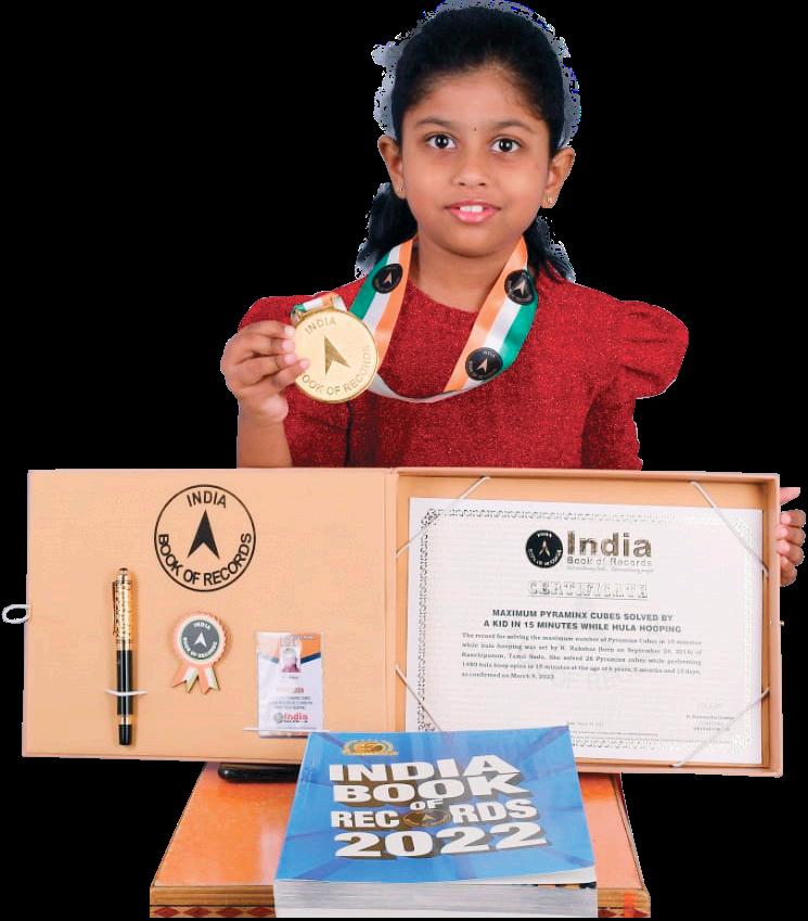 (born on February 12, 2015 ) of Chennai, Tamil Nadu, is appreciated for solving 15 different Rubik’s Cubes in 13 minutes and 58 seconds at the age of 7 years and 10 months, as confirmed on January 4, 2023.