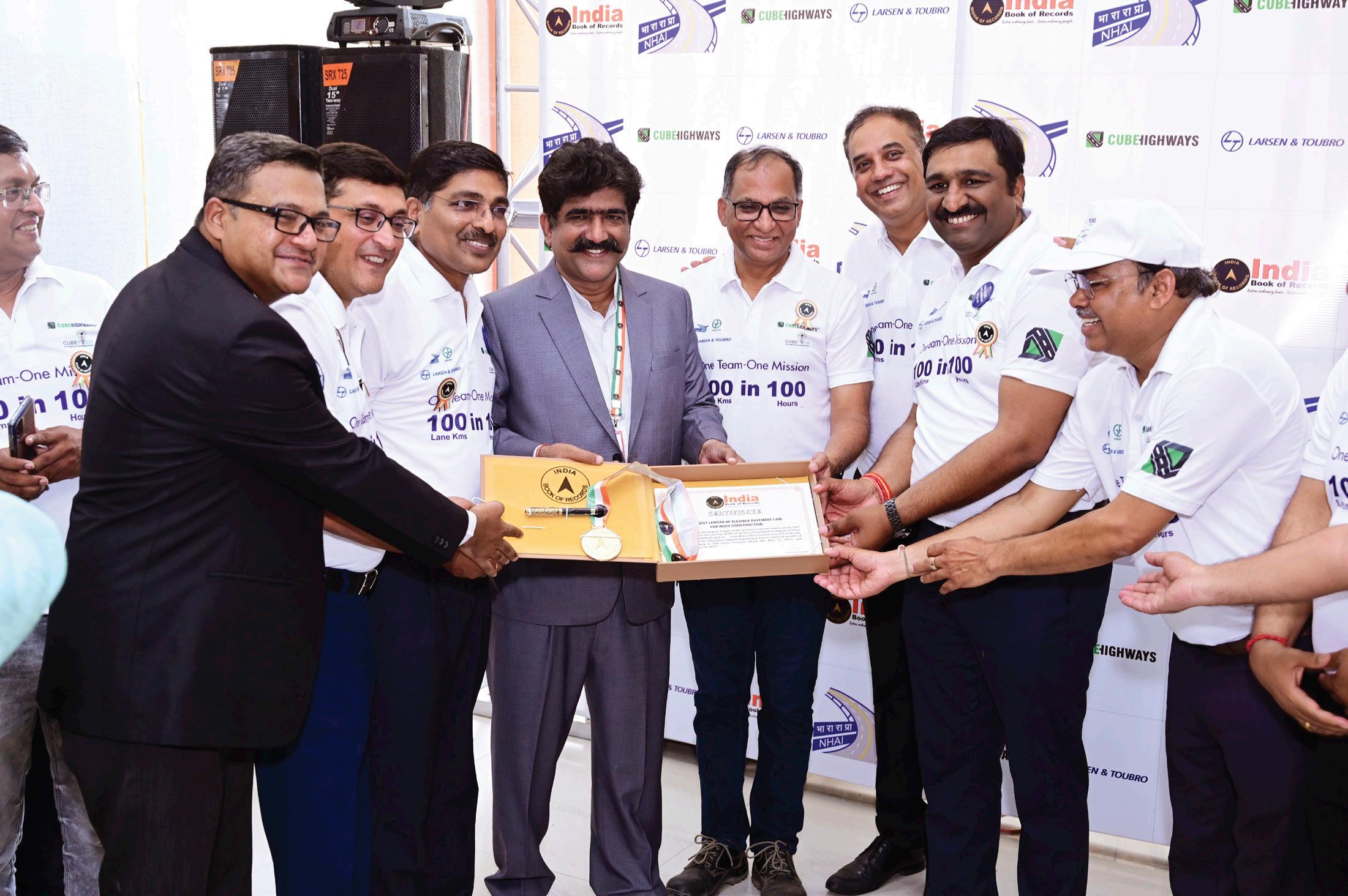 है। इस दृधष्टकोण को अपिा कर, हमि ईंिि की खपत और संबंधित ग्ीिहाउस गैस उत्सि्कि को काफी कम कर ददया है, जिससे हमारे काब्कि पदधचह्नों को कम करि म मदद धमल रही है।” एलएंिटी कं स्ट्क्शि ि इस ए्तसप्रेसवे पर दो ररकॉि्क बिाए। पहला सबसे लंबा फ्लेस््तसबल पेवमेंट तैयार करि का और दूसरा अधिकतम मारिा म नबटु धमिस कं क्रीट नबछाि का। दोिों कीर्तंमाि इंधिया बुक ऑफ ररकॉि्कस म दि्क हो चुके हैं। एिएच-34 का यह खंि उत्र प्रदेश म गाजियाबाद से अलीगढ़ के बीच पड़ता है। एलएंिटी की टीम ि 15 मई, 2023 को सुबह 10 बि से 19 मई, 2023 को दोपहर 2 बि तक 100 र्ंटे म गाजियाबाद-अलीगढ़ ए्तसप्रेसवे प्राइवेट ललधमटे ि (्तयूब हाईवे का एक एसपीवी) के ललए लस्तस लेविंग पररयोििा म 112.5 लेि नकलोमीटर नबटु धमिस कं क्रीट नबछा दी। धपछला ररकॉि्क 75 नकलोमीटर सड़क 75 र्ंटे म बिाि का र्ा। टीम ि इस खंि म 51,896 मीदट्क टि नबटु धमिस कं क्रीट नबछाई। गालजयाबाद से अिीगढ़ के बीच नेशनि हाइवे34 के एक सेक्शन पर एिएंडटी कंस्टक्शन द्ारा ‘सबसे िंबा फ्क्सिबि पेविेंट’ बनाने का ररकॉड स्ामपत कक या गया ह, जहां 100 घंटे ि 112.5 ककिोिीटर मबटमिनस कंक्ीट मबछाया गया। 5 कवर स्टोरी इंडिया बुक ऑफ रिकॉर्ड्स | िुलाई 2023