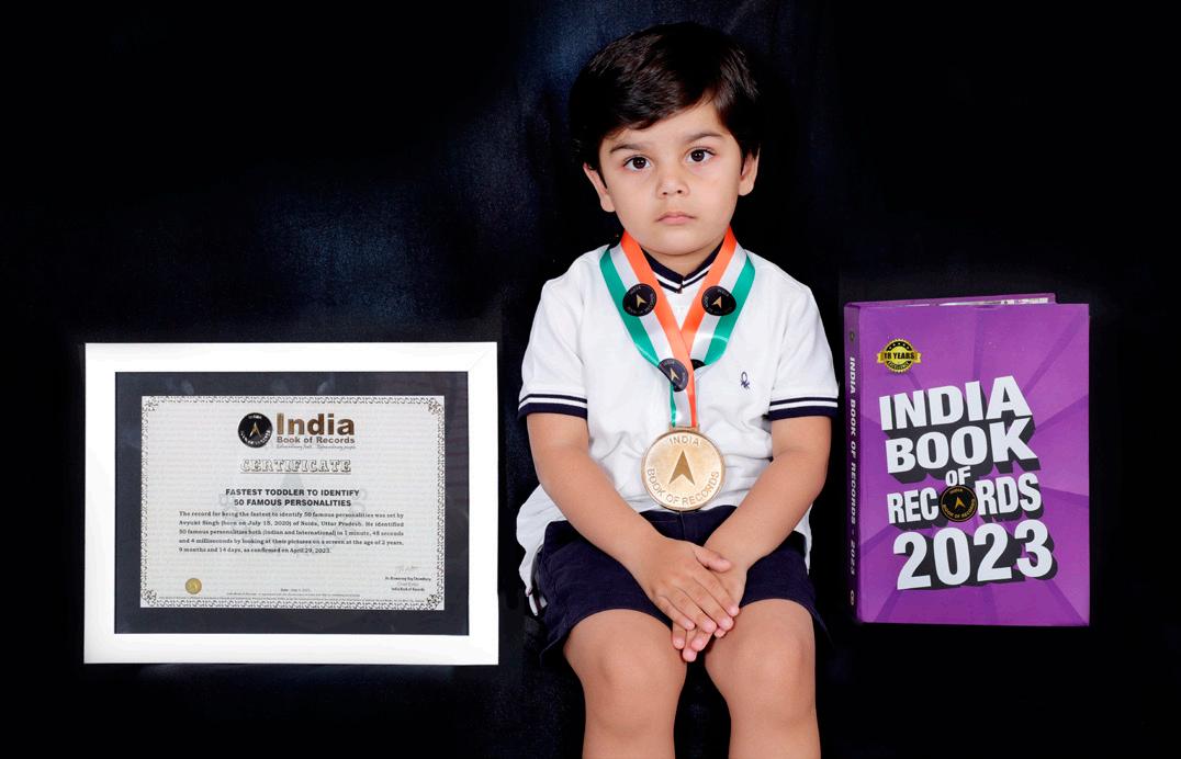 (born on July 6, 2020) of Bhubaneswar, Odisha, is appreciated for reciting the names of 28 Indian states and their capitals, 12 national symbols, 20 opposite words, 6 seasons, days of the week, months in a year, 19 vehicles, 11 shapes, 11 colours, 22 wild animals, 17 domestic animals, 19 fruits, 32 parts of the body, 31 action words, 3 mantras, 4 rhymes; and answering 25 G.K. questions at the age of 2 years and 10 months, as confirmed on May 17, 2023.
