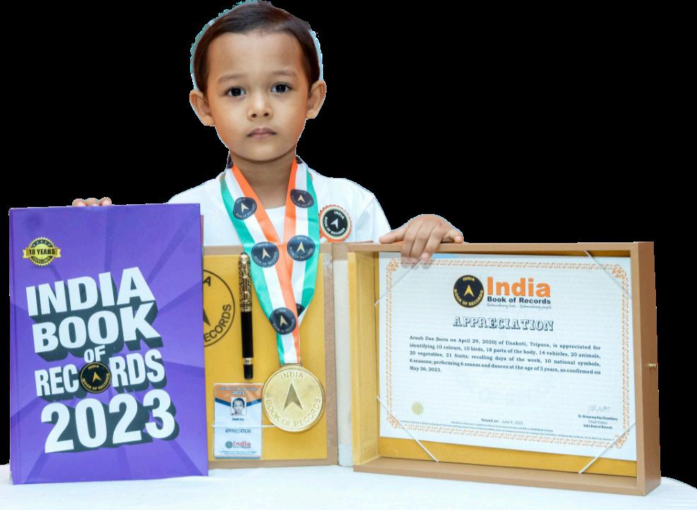 Arush Das (born on April 29, 2020) of Unakoti, Tripura, is appreciated for identifying 10 colours, 10 birds, 18 parts of the body, 14 vehicles, 20 animals, 20 vegetables, 21 fruits; recalling days of the week, 10 national symbols, 6 seasons; performing 6 asanas and dances at the age of 3 years, as confirmed on May 26, 2023.