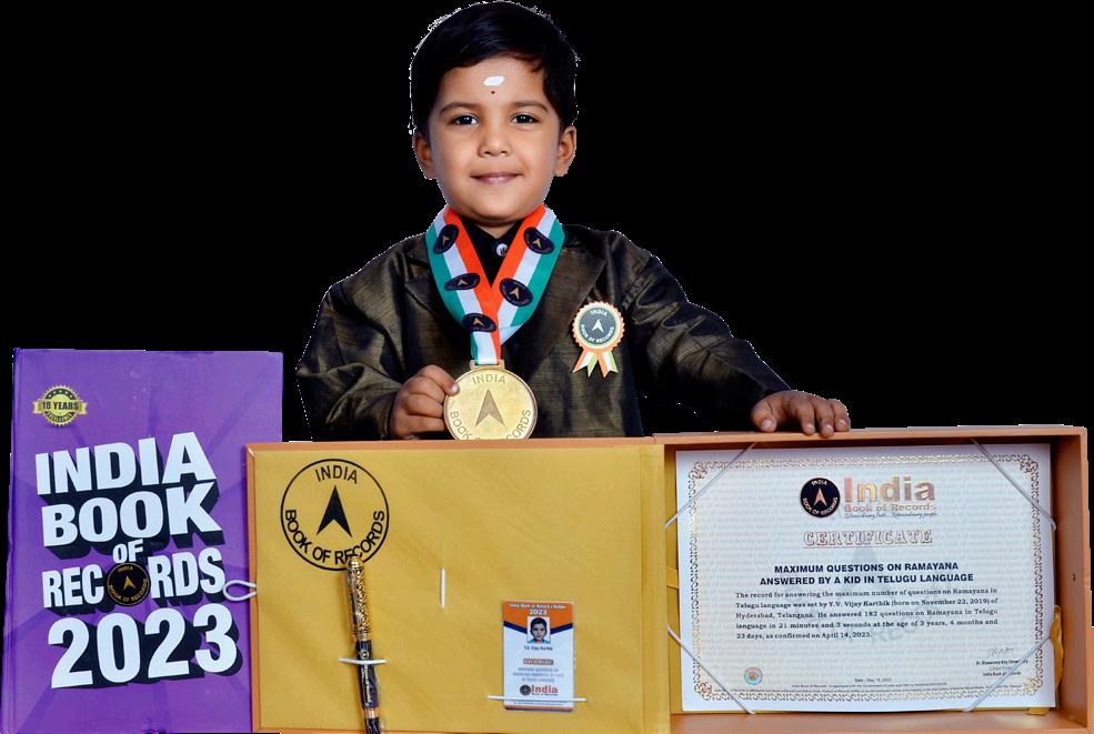 2020) of Belagavi, Karnataka, is appreciated for identifying 18 vehicles, 10 colours, 6 dry fruits, 13 wild animals, 7 national symbols; reciting 9 shlokas, 15 rhymes, days of the week, months in a year, letters of the alphabet from A to Z with their associated words; and identifying and recalling the names of 6 Mahabharat characters at the age of 2 years and 9 months, as confirmed on May 8, 2023.