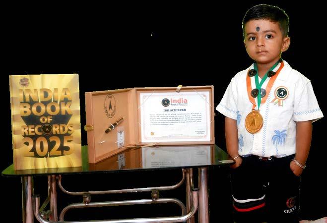 Reyansh Biswal (born on December 4, 2022) of Kendrapara, Odisha, is titled as ‘IBR achiever’ for identifying 21 parts of the body, 12 shapes, 34 animals, 9 birds, 10 flowers, 12 vehicles, 12 fruits, 14 vegetables, 10 colours, 12 sports and 9 musical instruments; reciting letters of the English alphabet with associated words, days of the week, months in a year and 10 English nursery rhymes; counting from 1 to 30, at the age of 2 years and 8 months, as confirmed on September 2, 2025.