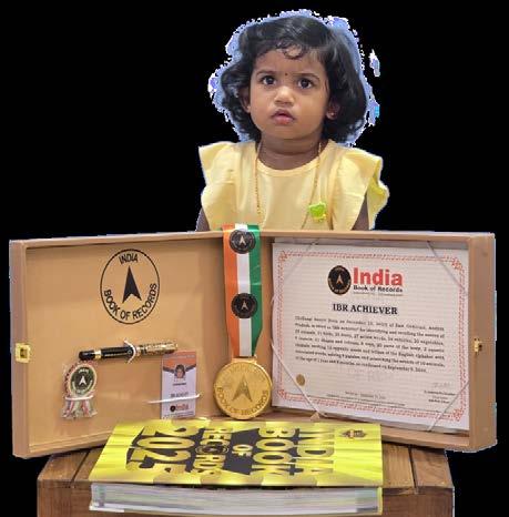 Pinna Krishitha (born on October 6, 2023) of Mancherial, Telangana, is titled as ‘IBR Achiever’ for identifying 26 animals, 27 professionals, 26 birds, 27 flowers, 26 alphabetical words, 24 parts of the body, 27 vehicles, 8 vegetables, 22 fruits, 6 actions, 9 shapes, 12 colours and young ones of 17 animals, at the age of 1 year and 11 months, as confirmed on September 19, 2025.