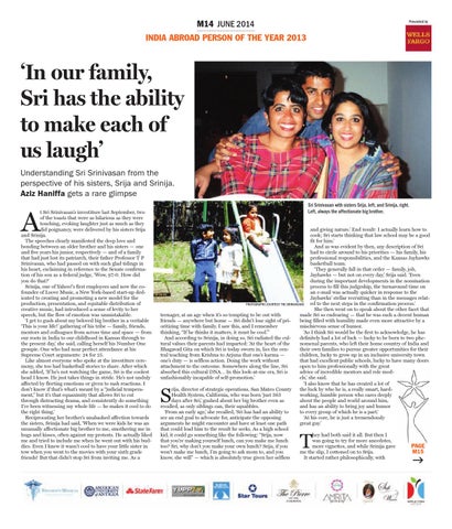 and giving nature.’ End result: I actually learn how to cook; Sri starts thinking that law school may be a good fit for him.’ And as was evident by then, any description of Sri had to circle around to his priorities — his family, his professional responsibilities, and the Kansas Jayhawks basketball team. ‘They generally fall in that order — family, job, Jayhawks — but not on every day,’ Srija said. ‘Even during the important developments in the nomination process to fill this judgeship, the turnaround time on an e-mail was actually quicker in response to the Jayhawks’ stellar recruiting than in the messages related to the next steps in the confirmation process.’ PHOTOGRAPHS COURTESY: THE SRINIVASANS She then went on to speak about the other facet that teenager, at an age when it’s so tempting to be out with made Sri so endearing — that he was such a decent human friends — anywhere but home — Sri didn’t lose sight of pribeing filled with humility made even more attractive by a oritizing time with family. I saw this, and I remember mischievous sense of humor. thinking, “If he thinks it matters, it must be cool.”’ ‘As I think Sri would be the first to acknowledge, he has And according to Srinija, in doing so, Sri radiated the culdefinitely had a lot of luck — lucky to be born to two phetural values their parents had imparted: ‘At the heart of the nomenal parents, who left their home country of India and Bhagavad Gita on which Sri is today sworn in, lies the centheir own families to pursue greater opportunities for their tral teaching from Krishna to Arjuna that one’s karma — children, lucky to grow up in an inclusive university town one’s duty — is selfless action. Doing the work without that had excellent public schools, lucky to have many doors attachment to the outcome. Somewhere along the line, Sri open to him professionally with the great absorbed this cultural DNA… In this look-at-me era, Sri is advice of incredible mentors and role modunfashionably incapable of self-promotion.’ els,’ she said. ‘I also know that he has created a lot of the luck by who he is, a really smart, hardrija, director of strategic operations, San Mateo County working, humble person who cares deeply Health System, California, who was born ‘just 363 about the people and world around him, days after Sri,’ gushed about her big brother even as and has an ability to bring joy and humor recalled, as only siblings can, their squabbles. to every group of which he is a part.’ ‘From an early age,’ she recalled, ‘Sri has had an ability to ‘At his core, he is just a tremendously see an end goal to advocate for, anticipate the opposing great guy.’ arguments he might encounter and have at least one path that could lead him to the result he seeks. As a high school kid, it could go something like the following: “Srija, now hey had both said it all. But then I that you’re making yourself lunch, can you make me lunch was going to try for more anecdotes, PAGE too? Sri, why don’t you make your own lunch? Srija, if you more vignettes, and while Srinija gave M15 won’t make me lunch, I’m going to ask mom to, and you me the slip, I cottoned on to Srija. know, she will” — which is absolutely true given her selfless It started rather philosophically, with