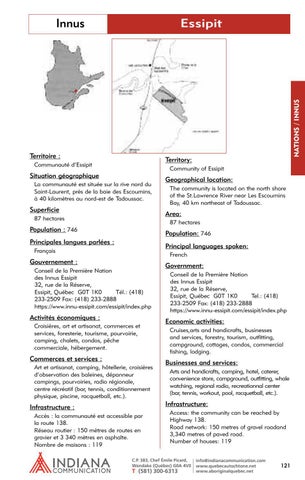 Government: Conseil de la Première Nation des Innus Essipit 32, rue de la Réserve, Essipit, Québec G0T 1K0 Tel.: (418) 233-2509 Fax: (418) 233-2888 https://www.innu-essipit.com/essipit/index.php