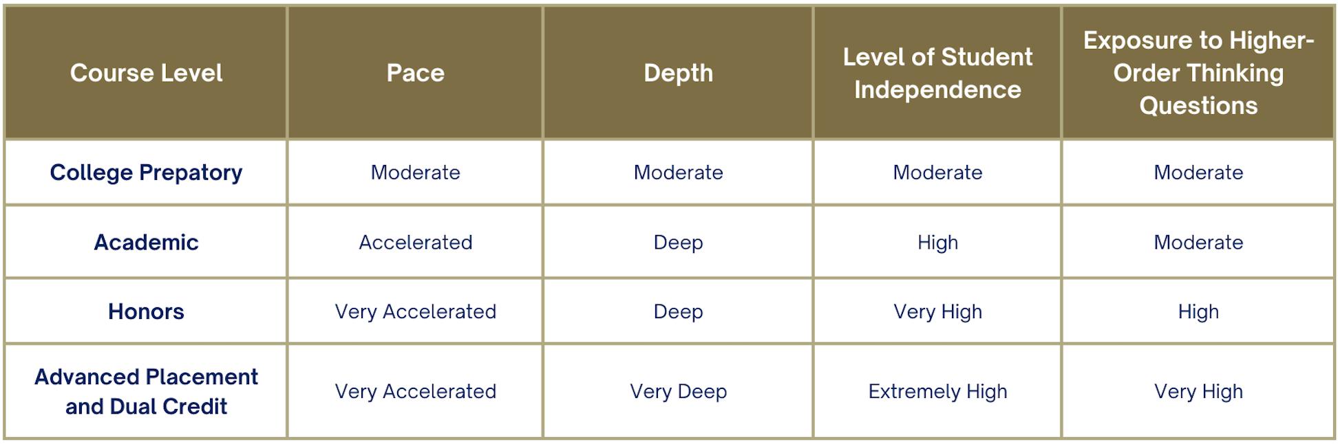 Adjustments in level placement may be made throughout the student’s education at Cathedral High School with teacher/counselor recommendation. If a student wishes to switch levels, recommendations may be needed from both the current and former subject teacher No student who moves “down” a level for any reason other than a math teacher recommendation may move “back up” without teacher approval Students who take a course at a level other than that recommended by the school may not switch levels until the end of the semester.