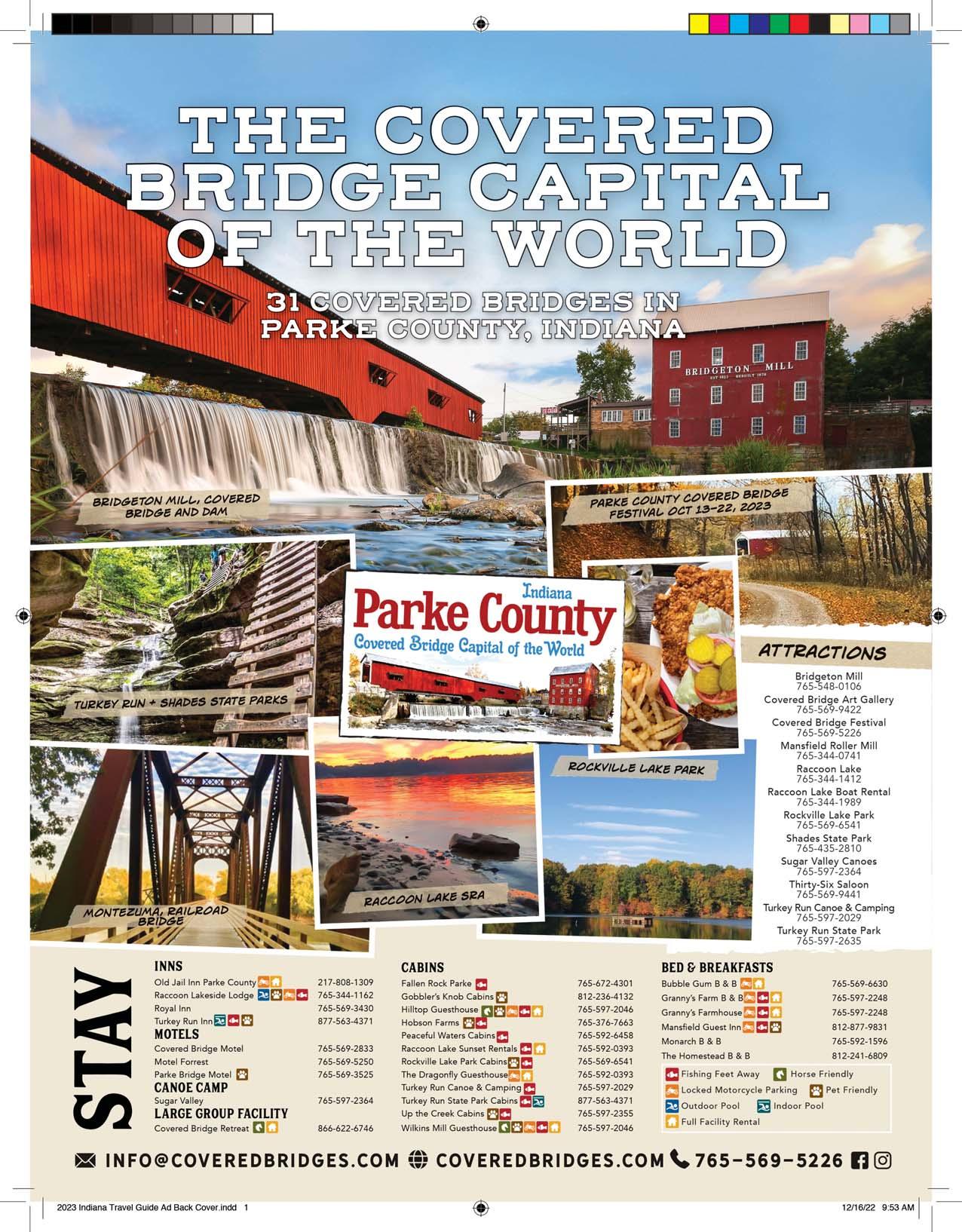 The Indiana Destination Development Corporation’s (IDDC) official Travel Guide is published annually. All rights reserved. No part of this publication may be reproduced or duplicated without written permission from the publisher. While every effort has been made to ensure the accuracy of the information provided in this publication at the time of printing, the advertisers and the editor shall not be liable for damages arising out of errors or omissions. Inclusion in this publication does not imply endorsement by the IDDC. The opinions expressed herein do not neces-sarily represent those of the publisher or the editor. ©2023 Indiana Destination Development Corporation