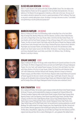 Kim is making her IRT debut. She has been a guest company member at the Denver Center Theatre Company for the past 14 seasons, and she represented the company as an inaugural Lunt-Fontanne Fellow at Ten Chimneys Foundation. Regional credits include Arizona Theatre Company, Portland Stage Company, Ebony Repertory Theatre, South Coast Repertory, Center Theatre Group/Kirk Douglas Theatre, Lake Dillon Theatre Company, Lone Tree Arts Center, Seattle Repertory Theatre, Syracuse Stage, Berkeley Repertory Theatre, Virginia Stage Company, Pittsburgh Public Theatre, Colorado Shakespeare Festival, Folger Theatre, Arena Stage, Hartford Stage, and the O’Neill Theatre Center. She has performed in numerous productions on and off Broadway. Film credits include First Sunday, Changing Lanes, Heat, Dragonfly, Bark, Holy Man, Deceived, and Amos & Andrew. Television appearances have included guest starring roles on Eleventh Hour, Army Wives, The Nine, Bones, Strong Medicine, Judging Amy, Law and Order, City of Angels, New York Undercover, and TNT’s original movie Glory and Honor. Kim is a native of Washington, D.C., and a graduate of the Juilliard School. 27