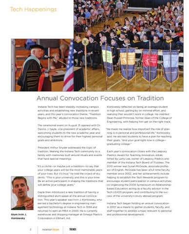 Annual Convocation Focuses on Tradition Indiana Tech has been steadily increasing campus activities and establishing new traditions in recent years, and this year’s convocation theme, “Tradition Begins with Me,” alluded to those new traditions. The ceremonial event on August 31 opened with Dr. Dennis J. Gayle, vice president of academic affairs, welcoming students to the new academic year and encouraging them to strive for their highest personal goals and ambitions. President Arthur Snyder addressed the topic of tradition, likening the Indiana Tech community to a family with memories built around rituals and events that have special meanings. “It’s a cliché—or maybe just a tradition—to say that your college years will be the most memorable years of your lives. But it’s true,” he told the crowd of students. “This is your university, and this is your time. Be an active participant in shaping the traditions that will define your college years.” Gayle then introduced a new tradition of having a distinguished alum speak at the annual convocation. This year’s speaker was Irvin J. Kontowsky, who earned a bachelor’s degree in engineering management technology at Indiana Tech in 1994 and returned to earn an MBA in 2000. He is currently warehouse and shipping manager at Omega Plastics Corporation in Elkhart, Ind.