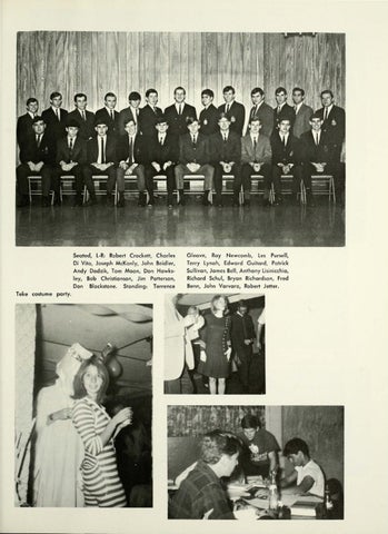 Seated, l-R: Rohert Crockett, Charles Di Vita, Joseph McKonly, John Beidler, Andy Dodzik, Tom Moon, Don Hawksley, Bob Christianson, Jim Patterson, Don Blackstone. Standing: Terrence Teke costume party.