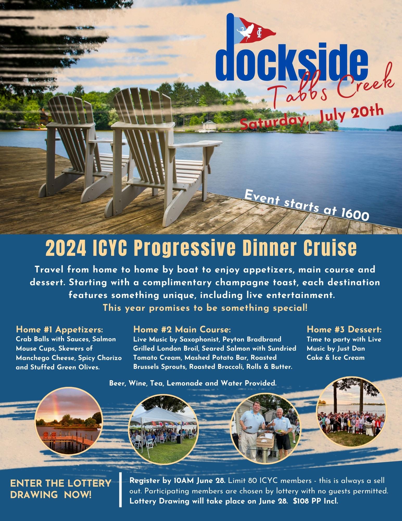NEW! Raffle for Free Sunset Cocktail Cruise on the Creek - Chance to win one of four cruises, generously provided by ICYCC member host boats. All raffle proceeds will benefit our great cause Drawing at Sunday Dinner!