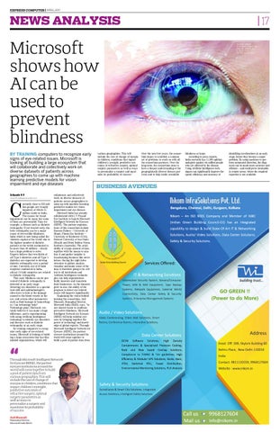 Microsoft shows how AI can be used to prevent blindness BY TRAINING computers to recognize early signs of eye-related issues, Microsoft is looking at building a large ecosystem that will collaborate and collectively work on diverse datasets of patients across geographies to come up with machine learning predictive models for vision impairment and eye diseases Srikanth R P srikanth.rp@expressindia.com