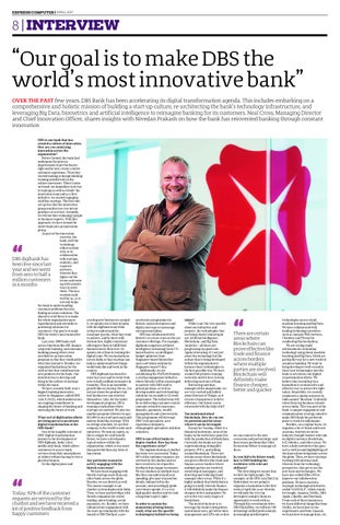 accelerator programme for fintech, social enterprises and digital start-ups to encourage entrepreneurialism. DBS has collaborated with fintech’s to create state-of-the-art customer offerings. For example, digibank comprises artificial intelligence technology from USbased Kasisto, an intelligent budget optimiser from Singapore-based Moneythor and a soft token solution by Singapore-based V-Key. Additionally, we are establishing the FinTech Foundry, a startup engagement initiative, where fintechs will be encouraged to partner with DBS staff to prototype ideas, as well as develop mobile and web banking solutions via an eight to 12-week programme. The initial focus will be on delivering customer-centric concepts related to insurance, deposits, payments, wealth management and cybersecurity. This programme will leverage DBS’ tech specialists, user experience designers, ethnographic specialists and data scientists. DBS is one of first banks to deploy chatbot. How has been the experience so far? The implementation of chatbot has been very successful. Today, 92% of the customer requests are serviced by the chatbot and we have recieved a lot of positive feedback from happy customers. We use chatbots in multiple ways like they can understand your spending, give past transaction details, balance left in the account, and accordingly guide your future spends. It’s a very high quality chatbot and we took a long time to get it right. In order to sustain the momentum of being futureready, what are the specific technological initiatives being