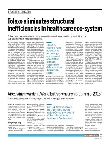 fact that delivering the product is necessary, but product availability is the utmost urgency. Following this, we are already equipped to provide turnkey solutions to segments like pathology labs, blood banks, etc, to begin with, with more segments to be added in the near future”, expressed MK Singh, GM – Category Management, Tolexo. Tolexo’s market outreach is quite impressive as is in the case of its parent company, IndiaMart with various selling platforms which include Tolexo’s mobile app, website, telesales and direct sales team. Taking a cue from the soon to happen Express Technology Sabha, Tolexo is eyeing a huge potential in the technology and internet penetration to fill up supply side deficiencies in the medical sector.