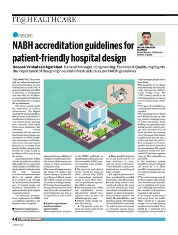 Deepak Venkatesh Agarkhed, General Manager –Engineering, Facilities & Quality, highlights the importance of designing hospital infrastructure as per NABH guidelines THE HOSPITAL X-Ray room wall was redone during hospital construction phase as room wall thickness was not 9 inch. A new air-conditioning unit added at pharmacy as temperature was more than 25o. NABH assessment pointed out that there is no child play area in hospital during assessment. The above examples point out deficiencies in hospital infrastructure. The biggest challenge for any operating hospital to secure accreditation is modification in infrastructure. The hospital project planning team normally takes inputs from various stakeholders like architects, service consultants and user team but tend to miss out on design considerations on NABH compliance with respect to infrastructure. In few cases the hospital planners try to justify their stand on facility requirement to hospital by using NABH as guidelines which may or may not be true. As mentioned in the NABH website, accreditation results in high quality of care and patient safety. Adoption of NABH standards related to infrastructure will help hospitals to achieve an environment conducive for patient safety. It is advised to go through the accreditation standards as part of hospital design and implement infrastruture requirements during the hospital construction phase. The necessary infrastructural requirements in NABH accreditation guidelines are divided in three categories. ■ Statutory requirements: There are some mandatory re-