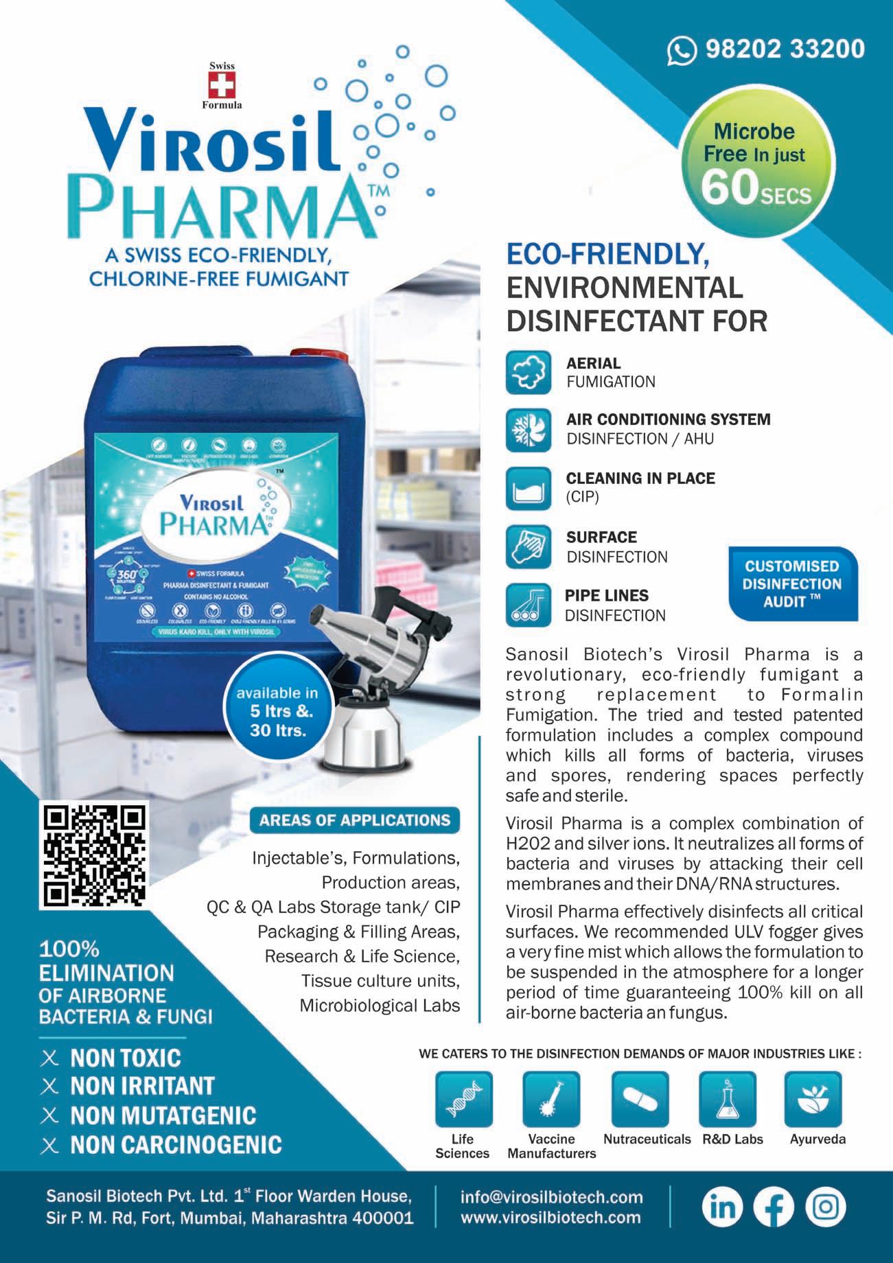 Sanosil Biotech is marketing this disinfectant under the 'Virosil Pharma' brand name and is targeting the entire industrial belt of India. The com-