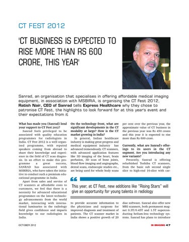 Sanrad, an organisation that specialises in offering affordable medical imaging equipment, in association with MSBIRIA, is organising the CT Fest 2012, Ratish Nair, CEO of Sanrad tells Express Healthcare why they chose to patronise CT Fest, the highlights to look forward for at this year's event and their expectations from it What has made you (Sanrad) lend your support to CT Fest 2012? Sanrad feels privileged to be associated with quality education programmes for radiologists in India. CT Fest 2012 is a well organised programme, with reputed speakers coming from abroad to share their knowledge and experience in the field of CT scan diagnosis. In an effort to make this programme a great success, SANRAD has associated with MSBIRIA, who have taken the initiative to conduct such a premium educational programme in India. Apart from sales and service of CT scanners at affordable costs to customers, we feel that there is a necessity for advanced educational programmes on the latest technology advancements from the world market, interacting with international luminaries in the radiology field gives confidence and imparts knowledge to our radiologists in India. OCTOBER 2012