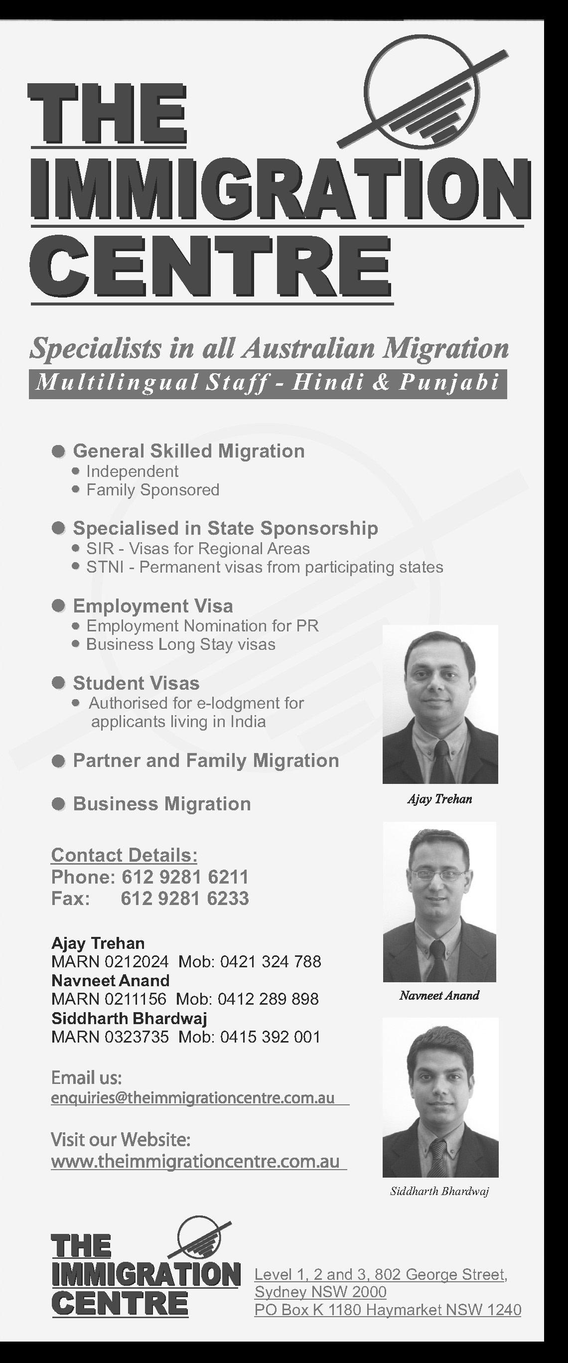 AUGUST (2) 2009 <> 5 NATIONAL EDITION As an overseas student, you deserve to know the right way to plan your future in Australia. At VisAinfo, we are fully equipped to guide you all the way. We believe in the power of knowledge and information. Whether you are a new student, mid-course or looking for further education, let us at VisAinfo help you achieve your objective of becoming an Australian resident. The right way. Call 02-9233 3128, 9231 2651 Level 9, Suite 3 A, 428 George Street (The Dymocks Building), Sydney NSW 2000 Tel: 02- 9233 3128, 9231 2651 email: info@visainfo.com.au A few minutes walk from Town Hall and Wynyard Stations • SYDNEY • NEW DELHI • CHANDIGARH • LUDHIANA • MUMBAI • PUNE Specially designed WORK & STUDY packages CRITICAL SKILLS LIST (CSL) Courses: • Air Conditioning & Refrigeration • Motor Mechanic • Electro Technology Other Popular Courses: TRADE: • Business Equipment • Cookery • Hair Dressing • Graphic Pre-Press • Horticulture • Community Welfare NON-TRADE: • Business Management • IT • Accounting (Paid work available directly through education provider. Conditions apply.) WE ORGANISE ADMISSIONS AND VISAS IN AUSTRALIA, NEW ZEALAND, UK & CANADA WORK PERMITS TO CANADA AVAILABLE. AUTHOURISED TAFE AGENT ABN: 44 124 427 729 WORDSWORTH CREATIVE