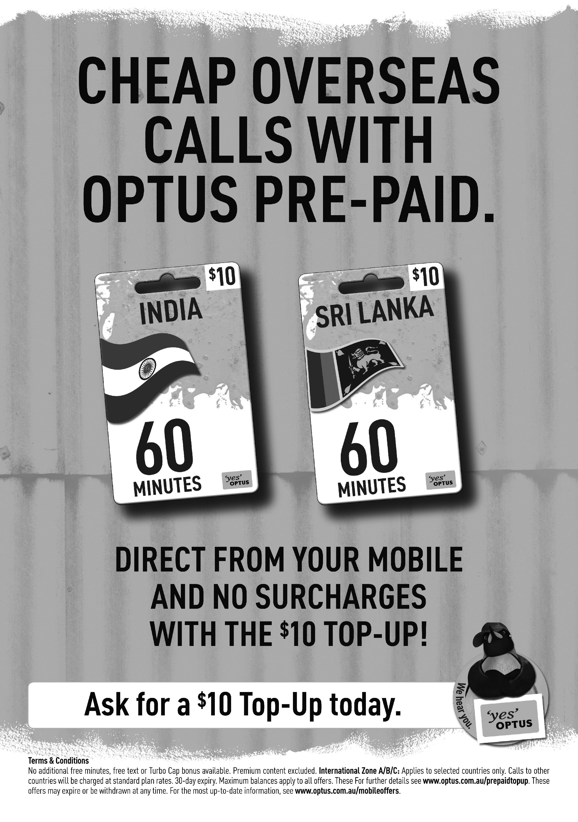 AUGUST (2) 2009 <> 65 NATIONAL EDITION 24/7 Rates Everyday No Connection Fee Bangladesh incl. Mobile Pakistan incl. Mobile ^ Sri Lanka incl. Mobile ^ 4.9c per min HOTNEWRATES! $50=$5 BONUS Australia UK USA incl. Mobile 1.9c per min Nepal - Kathmandu * Nepal incl. Mobile * Australia Mobile 5.9c per min 14.9c per min incl. Mobile per min All fees shown clearly below: Visit www.worldtelecom.com.au or call Customer Service for current rates and terms 1300 & 1800 Australia wide access numbers available (5c per min & 20c per min surcharge applies) 24HR CUSTOMER SERVICE/RECHARGE: 1300 668 270 | 15 LANGUAGES AVAILABLE Terms & Conditions: • Prices correct on 07/07/2009 and are subject to change without notice • All call charges rounded up to next 5 cents • All calls incur a 49c surcharge after 3 minutes except those marked which incur *69c, ^89c after 3 minutes. All calls then incur a 69c surcharge after 5 minutes • Calls are charged in blocks of 3 minute then subsequent 10 minute periods • 50c service fee applies every 2 days after first use • Card expires 3 months after first use or last recharge • Calls to satellite mobiles, special numbers and premium services may be charged at higher rates or blocked IL_PM_13G_I NEW AND IMPROVED RATES GIVE YOU MORE TALK TIME & NO CATCHES AVAILABLE FROM NEWSAGENCIES, SERVICE STATIONS, CONVENIENCE STORES AND LEADING RETAILERS OR BUY ONLINE AT www.worldtelecom.com.au MONTEZUMA’STM The taste of mexico 311 – 313 Church Street, Parramatta, NSW 2150, Tel: (02) 9689 3800 www.montezumas.com.au Operating Since 1994. Located in the heart of Parramatta on Church St, packed with exciting restaurants, alfresco dining and an abundance of life. Lively atmosphere and superb friendly service. Authentic Mexican Food Specialise in Vegetarian Variety Mention this ad to receive 25% off your total bill (limit one voucher per table, not valid with any other Montezuma's offer and expires on 30th September 2009)