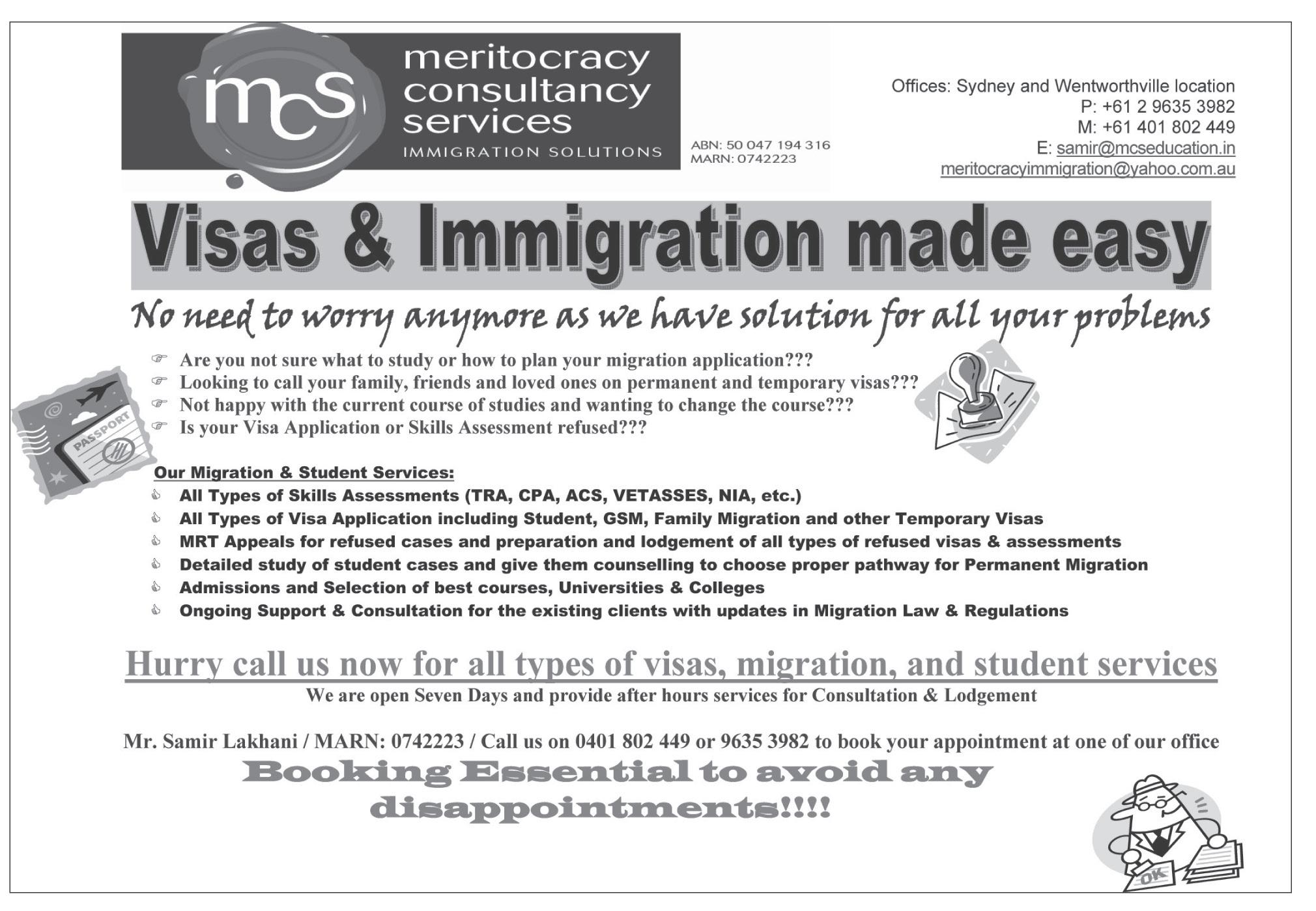 OCTOBER (1) 2009 <> 13 NATIONAL EDITION reliabilit y professionalism commitment i n tegr it y enc y transparenc y ef f ici Choosing the best migration consultant to present and manage your visa application may be the most challenging decision you face. Our dedicated team, backed by years of experience and strong knowledge base, will work diligently to achieve the best result for you. P: +61 2 9763 2221 M: +61 410 197 177 F: +61 2 9763 2212 Suite 103, Level 1, 7-9 Churchill Avenue, Strath eld NSW 2135, Australia (next to Strath eld train station) Thinking of Australia? Skilled & Regional Migration Student Enrolments & Visas Employer Nomination & Work Visas Business & Investor Visas Spouse/Partner Visas Child & Parent Visas Refugee Visas MRT & RRT Appeals Free English coaching (maximum 20 hours) for overseas students signing up before 31/12/2009 Wishing you a very Happy Diwali