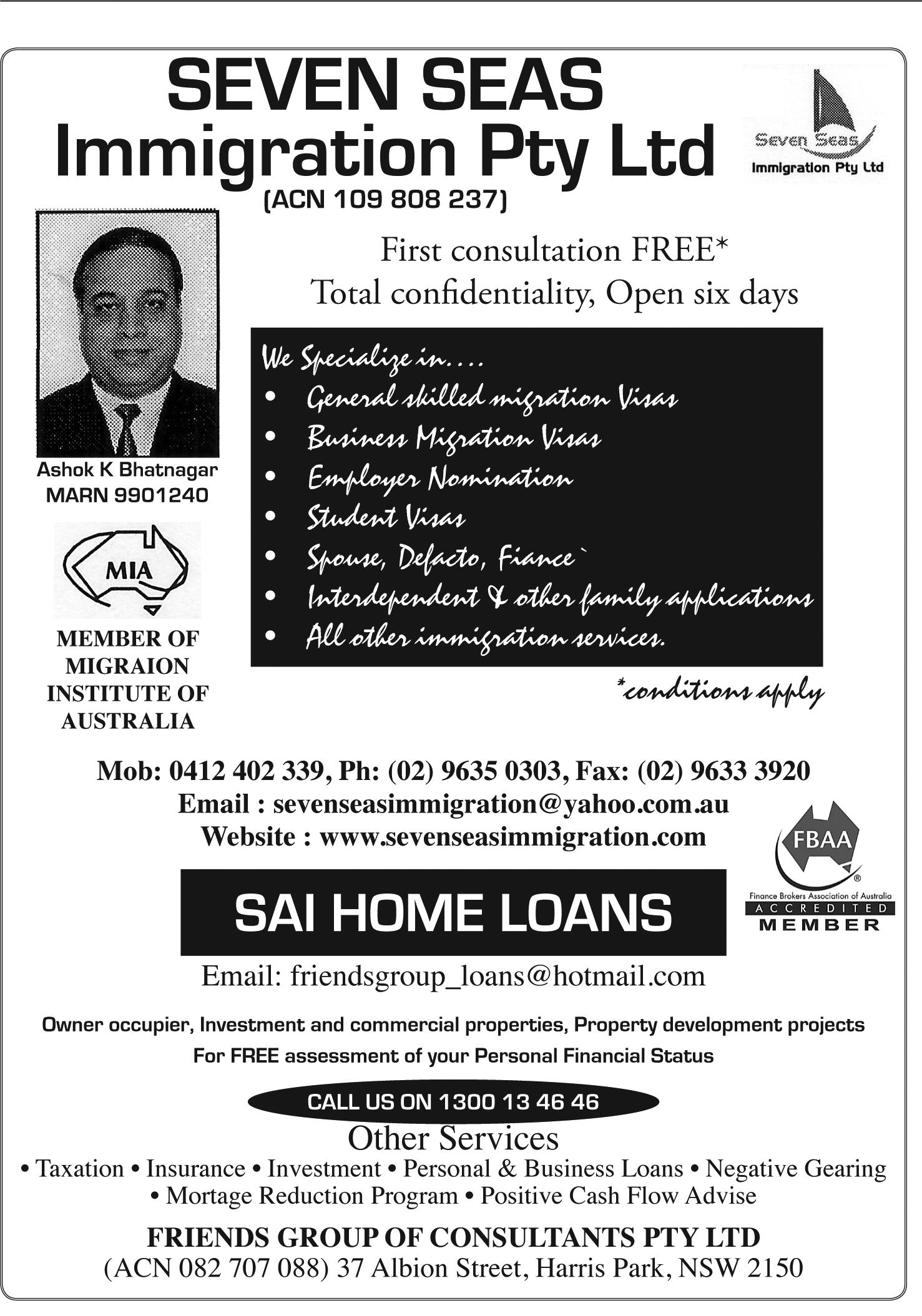 56 <> FEBRUARY (2) 2010 INDIAN LINK Evisalaw Australia Pty. Ltd., Suite 1, Level 3, 533 Kent Street, Sydney, NSW 2000 • Tel.: (02) 92643011 Fax: (02) 92643922 • manish@evisalawaustralia.com CRICOS Code: 02635D CRICOS Code: 01241G CRICOS Code: 02831M Courses available throughout Australia in associations with leading Universities and Institutes. CRICOS Code: 02838D CRICOS Code: 02876J Visitors parking available pursueHelping you a betterlife CRICOS Code: 02938M CRICOS Code: 02928B