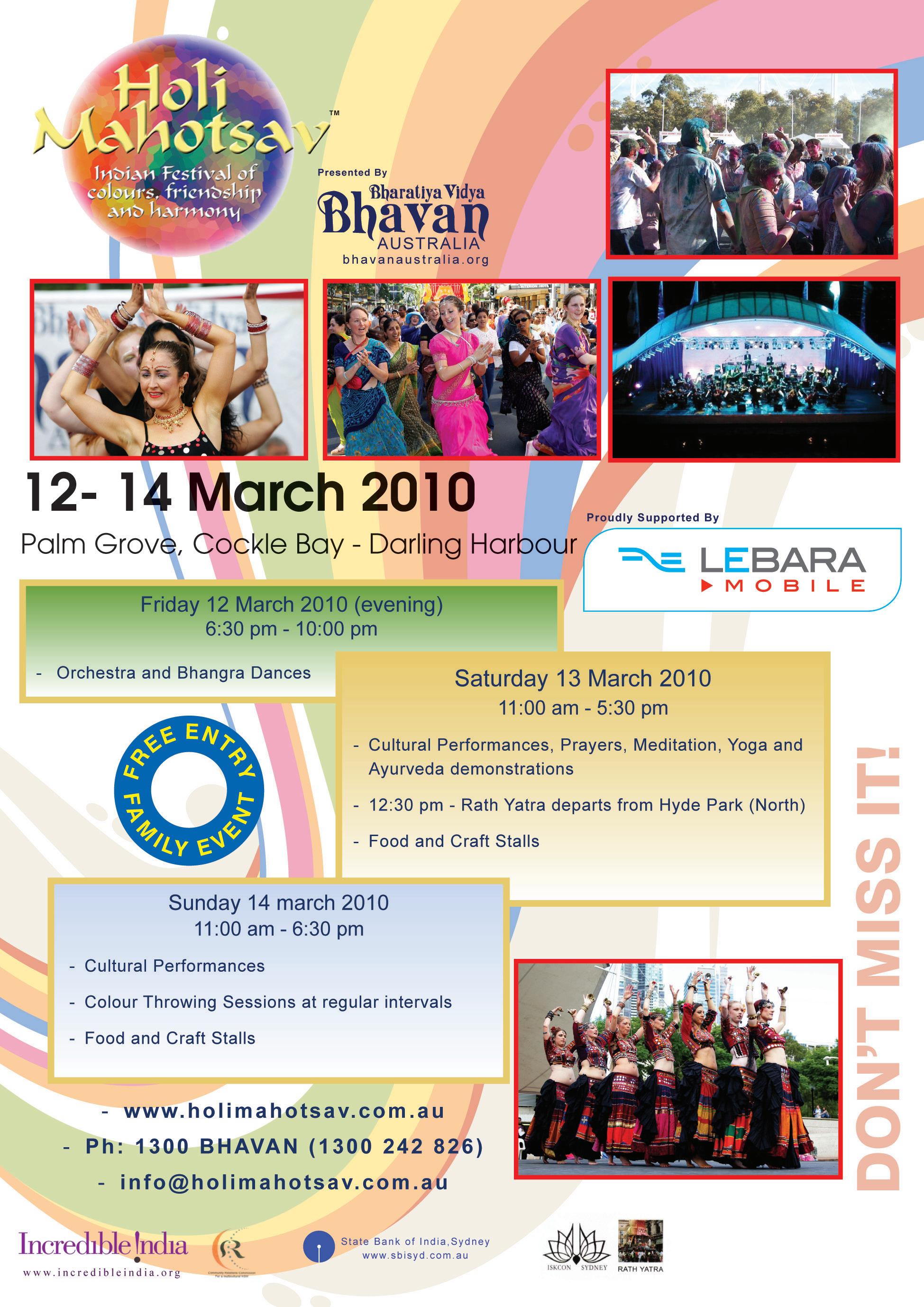 7 Mar Holi celebrations (Seeing one-ness) organised by the Chinmaya Yuvekendra (Senior, Junior) and Balavihar Castle Hill, 10.00am to midday, at Chinmaya Sannidhi, 38 Carrington Road, Castle Hill.