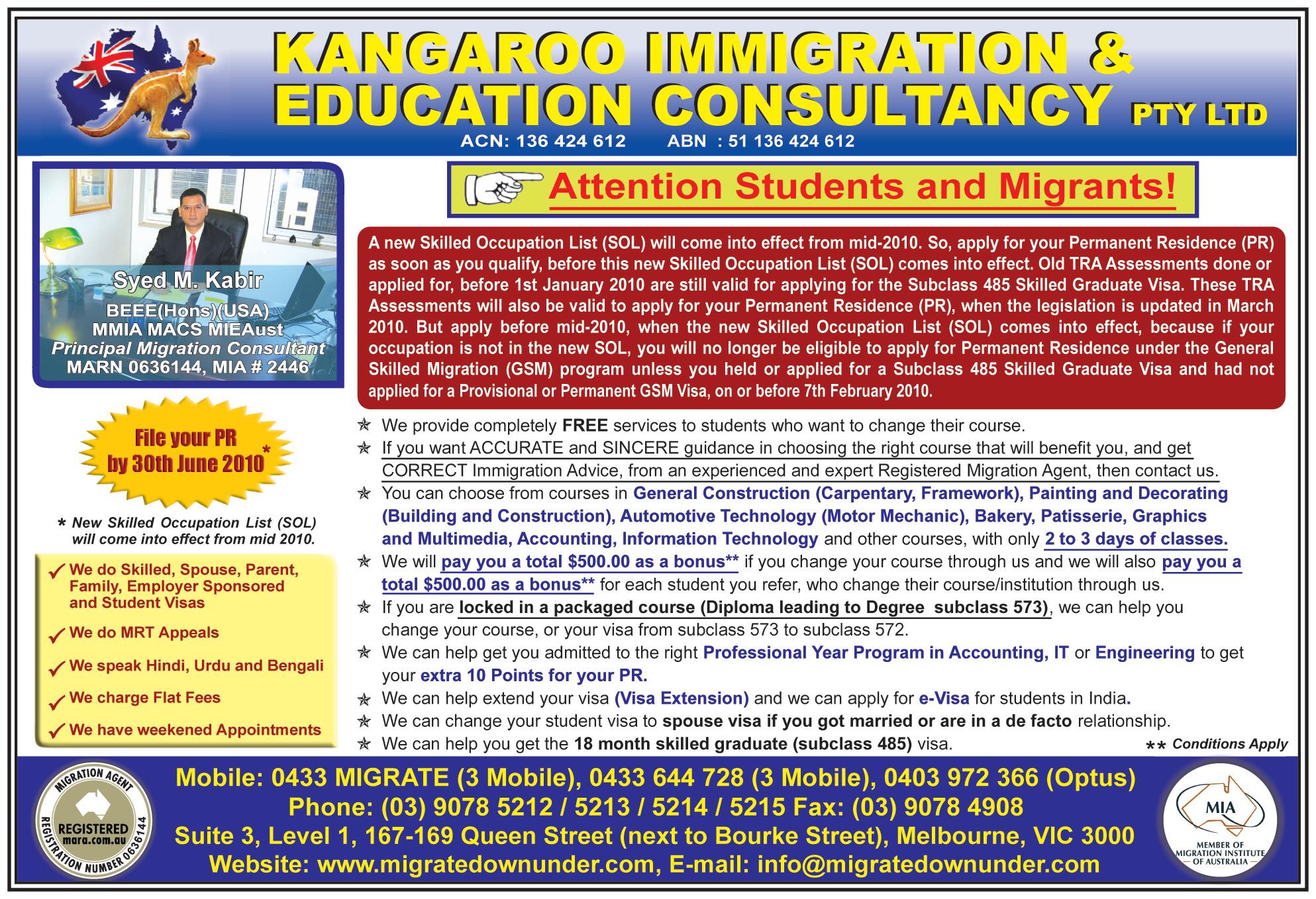 no guarantee that the SOL announced in mid-2010 will not change by the time they are eligible for PR. The new laws will work in the favour of meeting skill shortages in key areas in Australia. At the same time, students will still be able to come to Australia to study and enhance their chances of employment. It will also encourage students to seek employment in their related area of study.