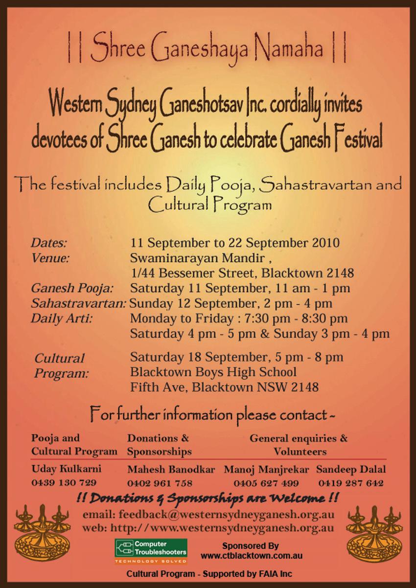 Sun 22 Aug To promote and develop universal fellowship and friendship in a multicultural society, support and promote multiculturalism, Vishva Hindu Parishad of Australia Inc’s NSW Chapter will organise a day-long celebration of the Hindu festival of Rakshabandhan. 11.00 am at Harvey Lowe Pavilion, Castle Hill Showground in Sydney. Entry is free. Details Brij Pal Singh 02 9484 5204.