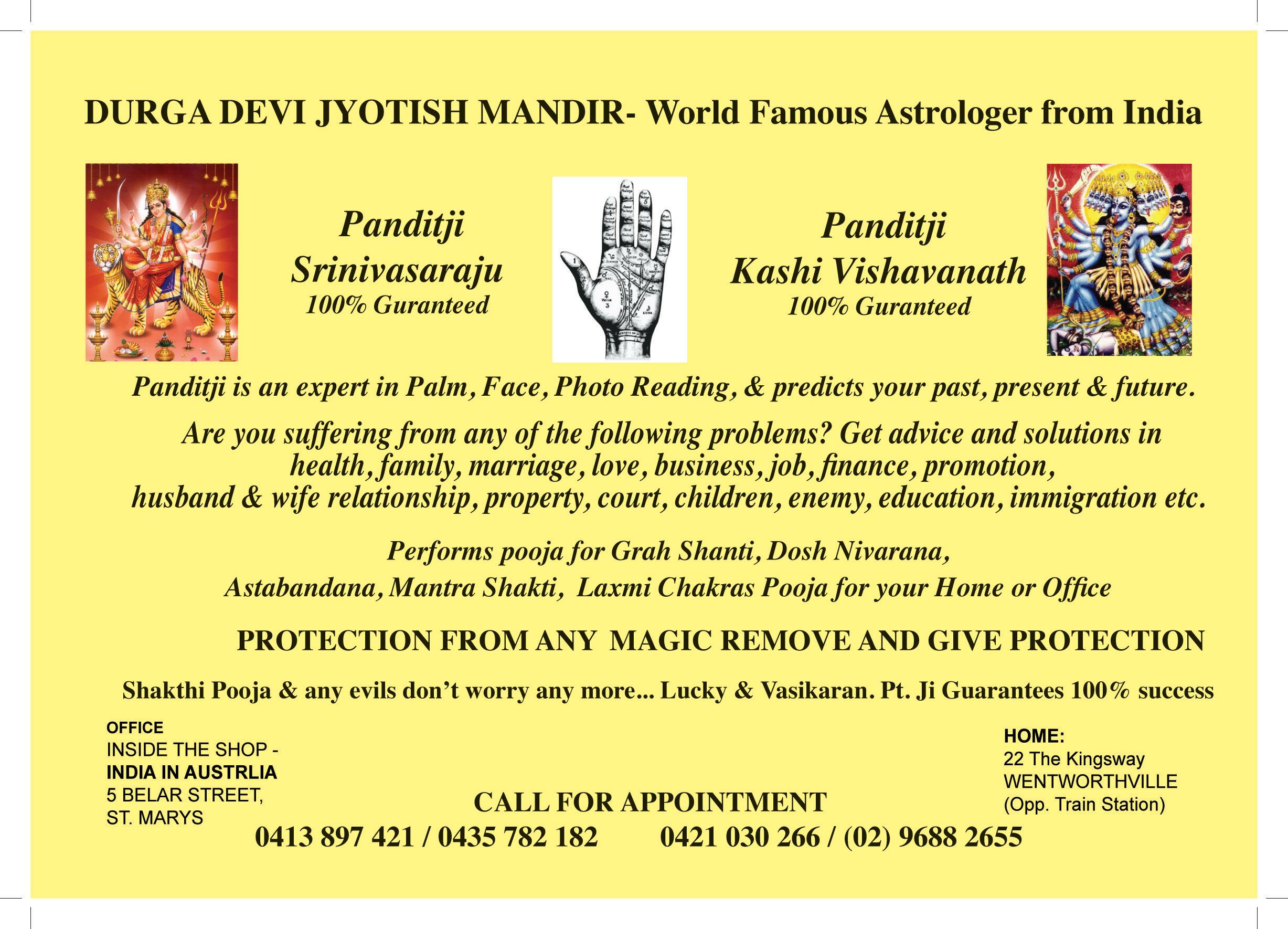 21 Sept – 11 Oct Global Organisation for Divinity announces the Sydney tour of spiritual leader Bhagyaji. He will give public lectures, conduct a mass prayer for world peace and harmony, and attend workshops and seminars. Details Jayanthi Ramanan 02 9614 1784, 0430 487 781.