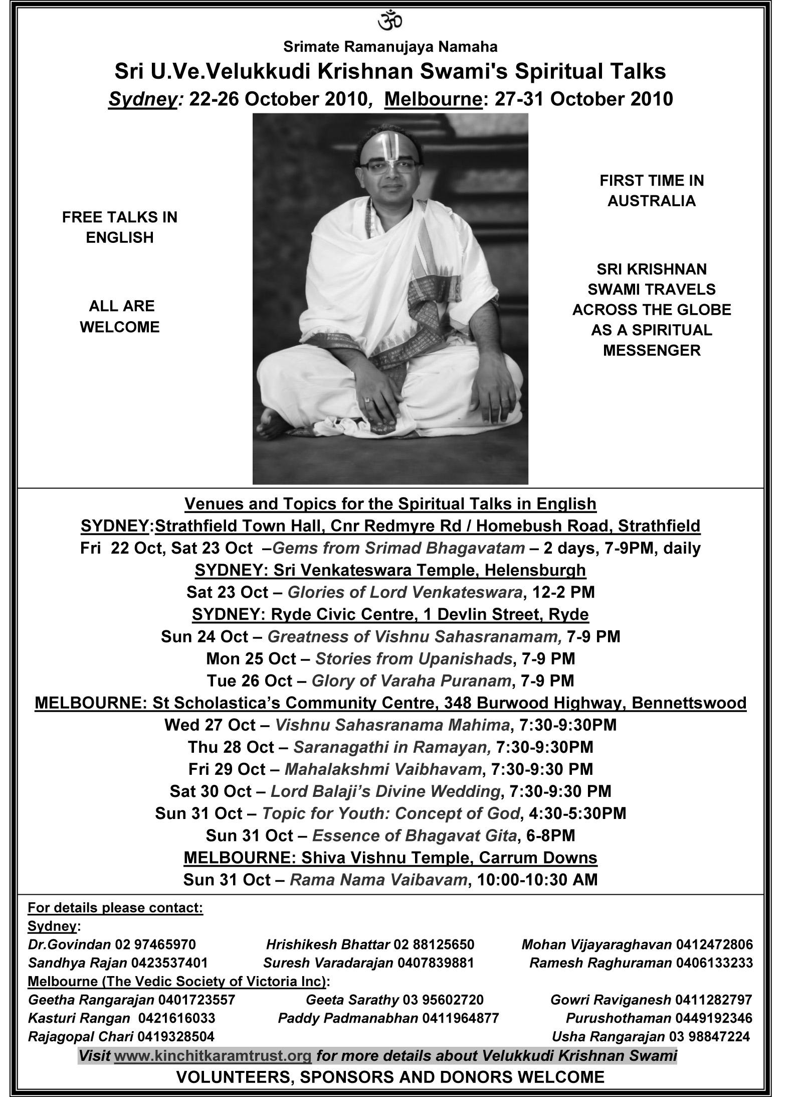 Venue: Vedanta Hall, 15 Liverpool Road, Croydon. Details: phone – 9745 4320 or email us: vedantasyd@idx.com.au